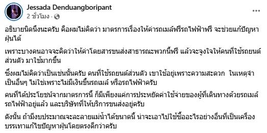 นอกจากนั้น อ.เจษฎา ก็ยังได้มีการโพสต์ชี้แจงเพิ่มเติม ระบุว่า “อธิบายนิดนึงนะครับ คือผมไม่คิดว่า มาตรการเรื่องให้ค่ารถเมล์ฟรีรถไฟฟ้าฟรี จะช่วยแก้ปัญหาฝุ่นได้ เพราะบางคนอาจจะคิดว่าให้ค่าโดยสารขนส่งสาธารณะพวกนี้ฟรี แล้วจะจูงใจให้คนที่ใช้รถยนต์ส่วนตัว มาใช้มากขึ้น