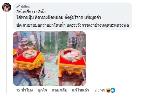 ใส่พานปุ๊บ ติดทองนิดหน่อย ตั้งตู้บริจาค เพิ่มมูลค่า ปล.คนขายบอกว่าอย่าโดนน้ำ และระวังกาวตราช้างหลุดนะหลวงพ่อ”