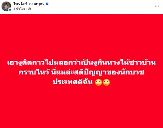 ขณะที่ทางด้าน แพรรี่ ไพรวัลย์ ก็ได้ออกมาเคลื่อนไหวถึงประเด็นดังกล่าวทางหน้าเฟซบุ๊กส่วนตัวด้วยเช่นกัน ระบุว่า “เอางูติดกาวไปหลอกว่าเป็นงูกินหางให้ชาวบ้านกราบไหว้ นี่แหล่ะสติปัญญาของนักบวชประเทศดิฉัน”