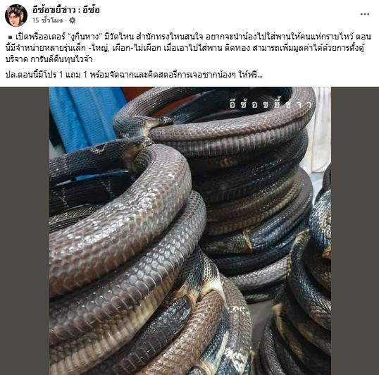 ล่าสุดทางเพจดังอย่าง อีซ้อ : ขยี้ข่าวอีซ้อ ก็ได้ออกมาโพสต์ภาพของ ซากงูกินหาง ที่วางทับซ้อนกันเป็นแถวจำนวนหลายสิบตัว พร้อมระบุข้อความว่า “เปิดพรีออเดอร์ “งูกินหาง” มีวัดไหน สำนักทรงไหนสนใจ อยากจะนำน้องไปใส่พานให้คนแห่กราบไหว้ ตอนนี้มีจำหน่ายหลายรุ่นเล็ก -ใหญ่, เผือก-ไม่เผือก เมื่อเอาไปใส่พาน ติดทอง สามารถเพิ่มมูลค่าได้ด้วยการตั้งตู้บริจาค การันตีคืนทุนไวจ้า