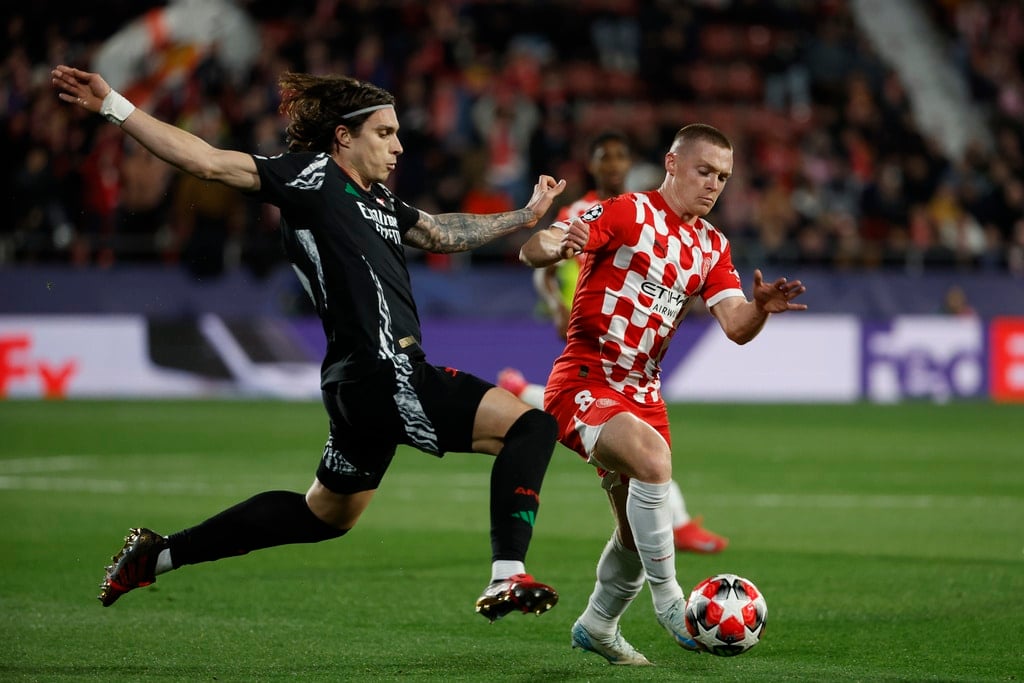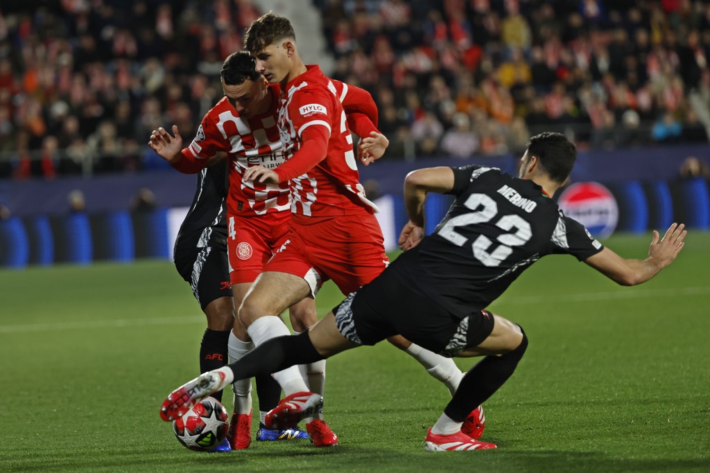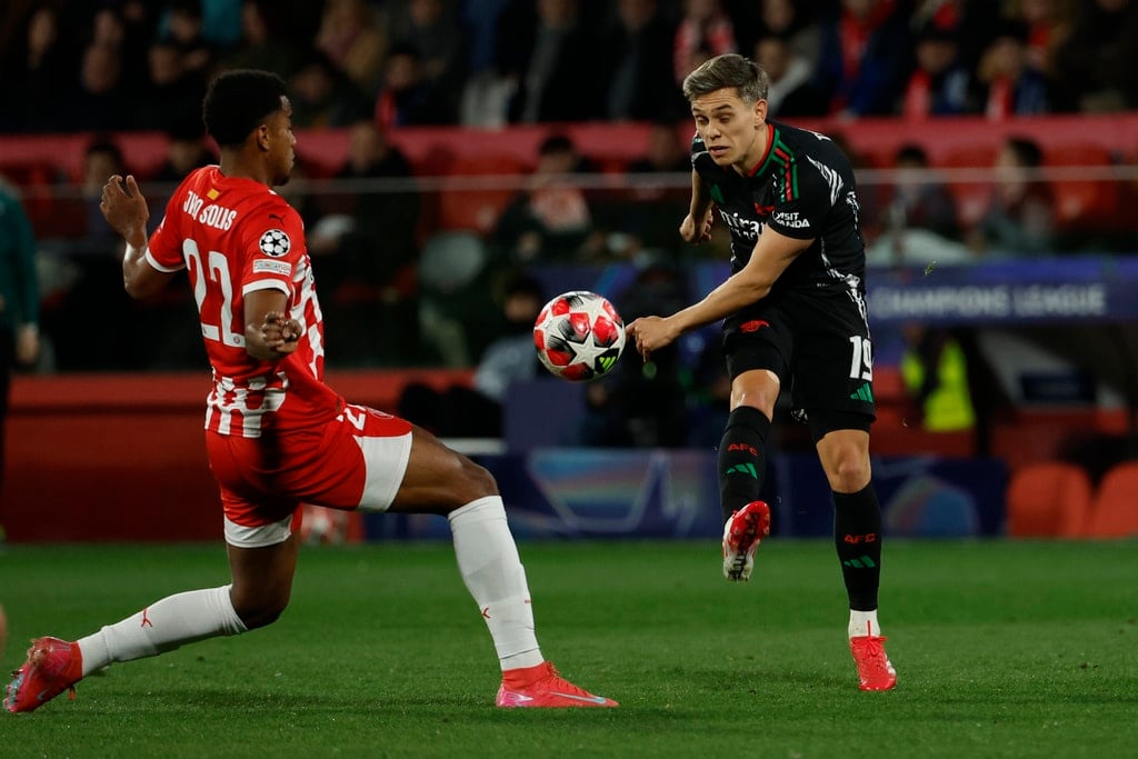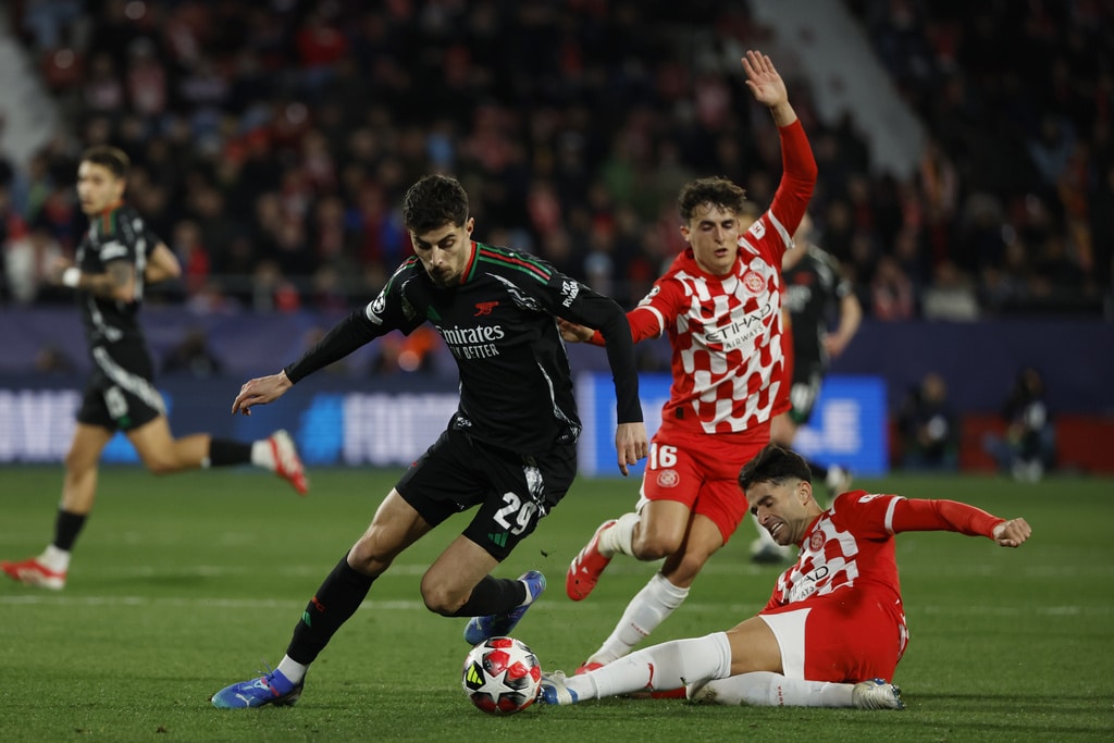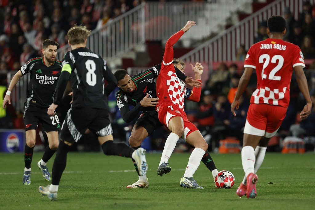 Arsenal’s Mikel Merino, right, challenges for the ball with Girona’s Arnau Martinez, left and Miguel Gutierrez during the Champions League opening phase soccer match between Girona and Arsenal at the Estadi Montilivi in Girona, Spain, Wednesday, Jan. 29, 2025. (AP Photo/Joan Monfort)Arsenal’s Kai Havertz, left is tackled by Girona’s Juanpe, right, during the Champions League opening phase soccer match between Girona and Arsenal at the Estadi Montilivi in Girona, Spain, Wednesday, Jan. 29, 2025. (AP Photo/Joan Monfort)Girona’s Cristhian Stuani, centre right, is challenged by Arsenal’s Gabriel during the Champions League opening phase soccer match between Girona and Arsenal at the Estadi Montilivi in Girona, Spain, Wednesday, Jan. 29, 2025. (AP Photo/Joan Monfort)Arsenal’s Leandro Trossard, right, is challenged by Girona’s Jhon Solis during the Champions League opening phase soccer match between Girona and Arsenal at the Estadi Montilivi in Girona, Spain, Wednesday, Jan. 29, 2025. (AP Photo/Joan Monfort)Arsenal’s Jorginho celebrates after scoring his side’s first goal from a penalty kick during the Champions League opening phase soccer match between Girona and Arsenal at the Estadi Montilivi in Girona, Spain, Wednesday, Jan. 29, 2025. (AP Photo/Joan Monfort)Girona’s Viktor Tsygankov, right is challenged by Arsenal’s Riccardo Calafiori during the Champions League opening phase soccer match between Girona and Arsenal at the Estadi Montilivi in Girona, Spain, Wednesday, Jan. 29, 2025. (AP Photo/Joan Monfort)