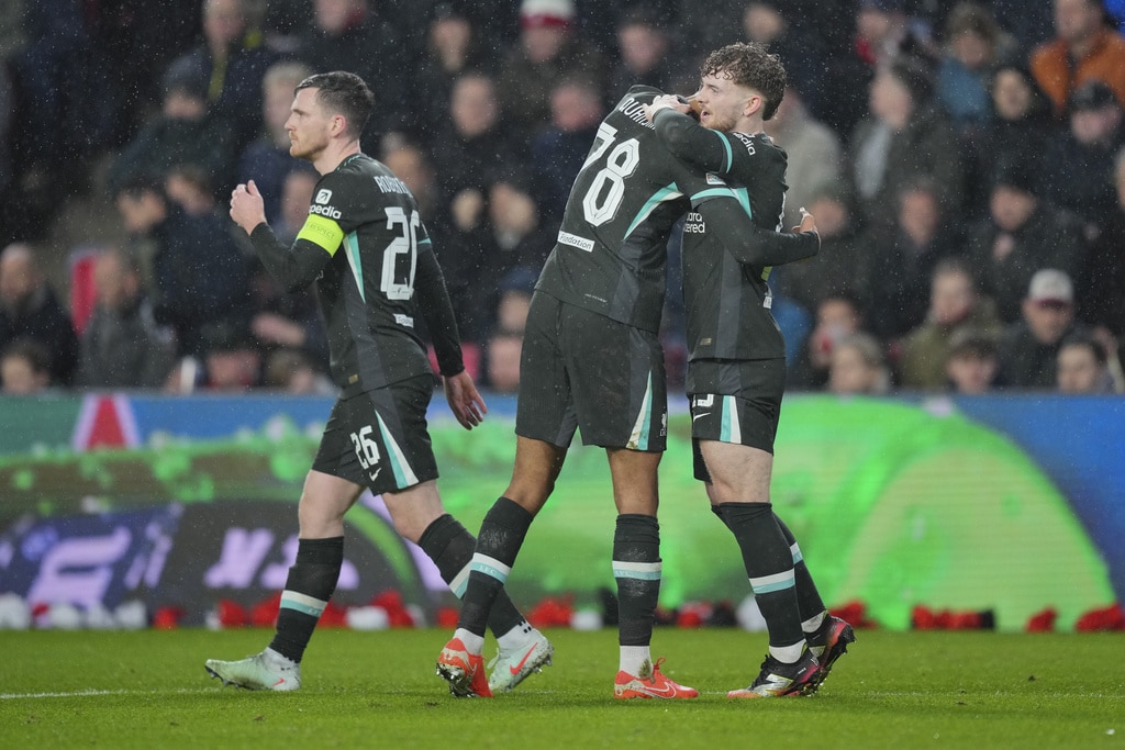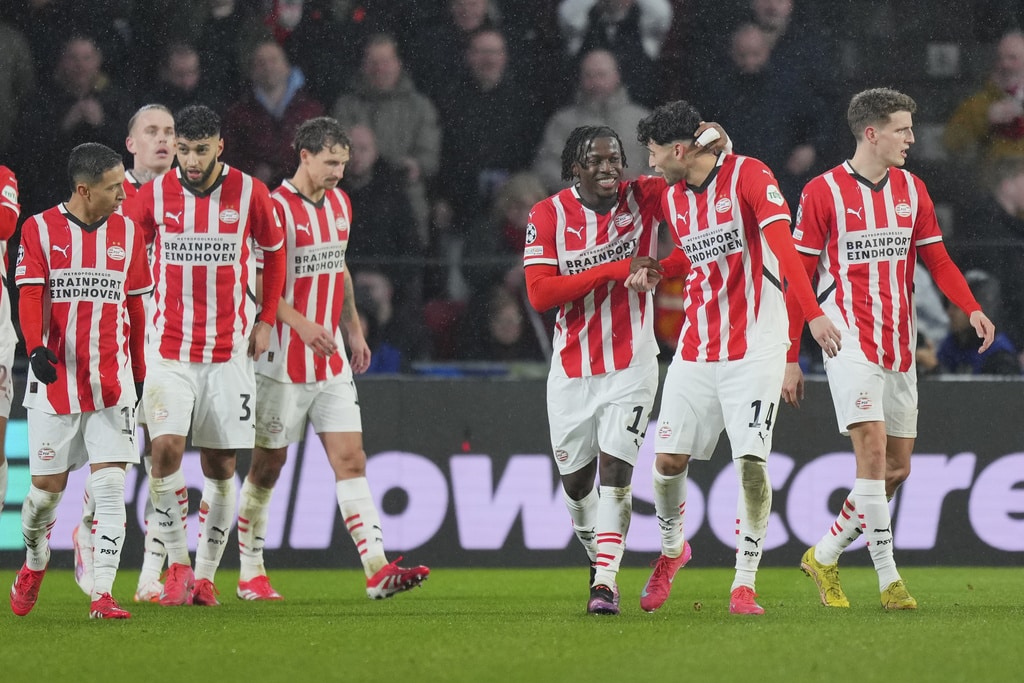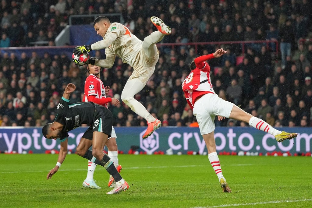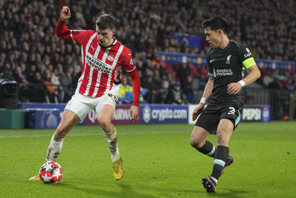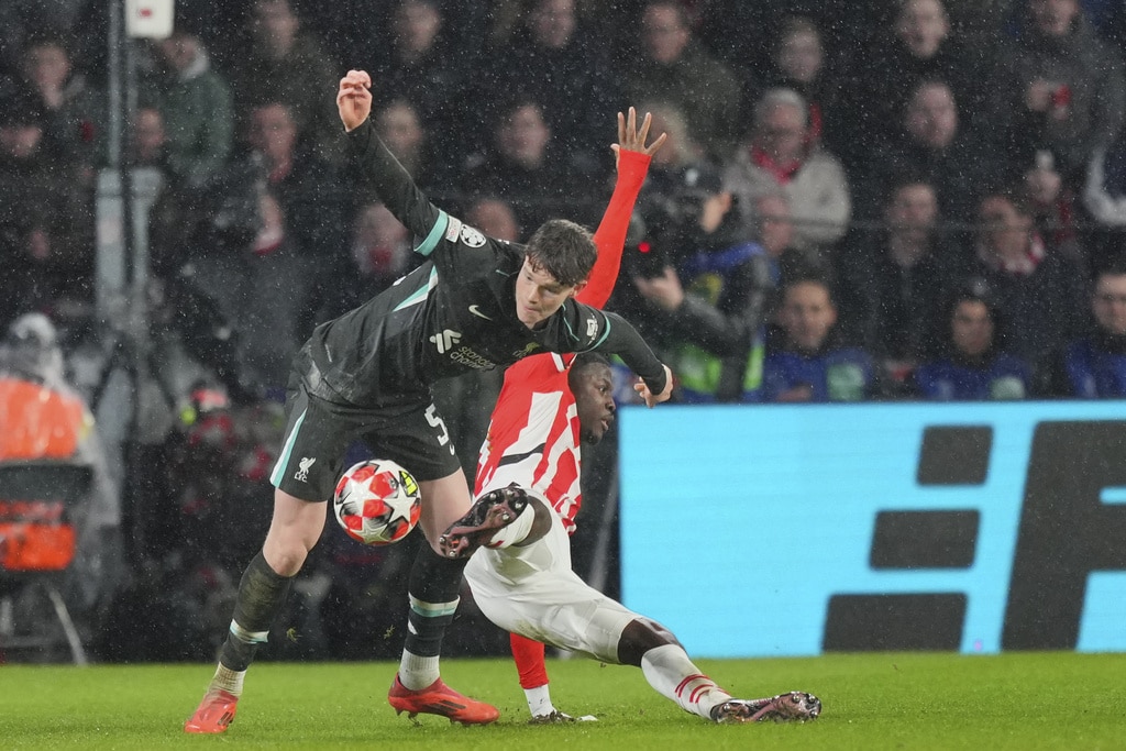 PSV’s goalkeeper Walter Benitez saves over Liverpool’s Cody Gakpo during the Champions League opening phase soccer match between PSV and Liverpool at Phillips Stadium in Eindhoven, Netherlands, Wednesday, Jan. 29, 2025. (AP Photo/Peter Dejong)Liverpool’s Amara Nallo receives a red card during the Champions League opening phase soccer match between PSV and Liverpool at Phillips Stadium in Eindhoven, Netherlands, Wednesday, Jan. 29, 2025. (AP Photo/Peter Dejong)PSV’s Guus Til in action by Liverpool’s Wataru Endo during the Champions League opening phase soccer match between PSV and Liverpool at Phillips Stadium in Eindhoven, Netherlands, Wednesday, Jan. 29, 2025. (AP Photo/Peter Dejong)Liverpool’s Cody Gakpo blocks the shot from PSV’s Ismael Saibari during the Champions League opening phase soccer match between PSV and Liverpool at Phillips Stadium in Eindhoven, Netherlands, Wednesday, Jan. 29, 2025. (AP Photo/Peter Dejong)Liverpool’s James McConnell, left, and PSV’s Johan Bakayoko fight for the ball during the Champions League opening phase soccer match between PSV and Liverpool at Phillips Stadium in Eindhoven, Netherlands, Wednesday, Jan. 29, 2025. (AP Photo/Peter Dejong)PSV players celebrate after a goal during the Champions League opening phase soccer match between PSV and Liverpool at Phillips Stadium in Eindhoven, Netherlands, Wednesday, Jan. 29, 2025. (AP Photo/Peter Dejong)Liverpool’s Jarell Quansah, left, and Harvey Elliott celebrate after a goal during the Champions League opening phase soccer match between PSV and Liverpool at Phillips Stadium in Eindhoven, Netherlands, Wednesday, Jan. 29, 2025. (AP Photo/Peter Dejong)