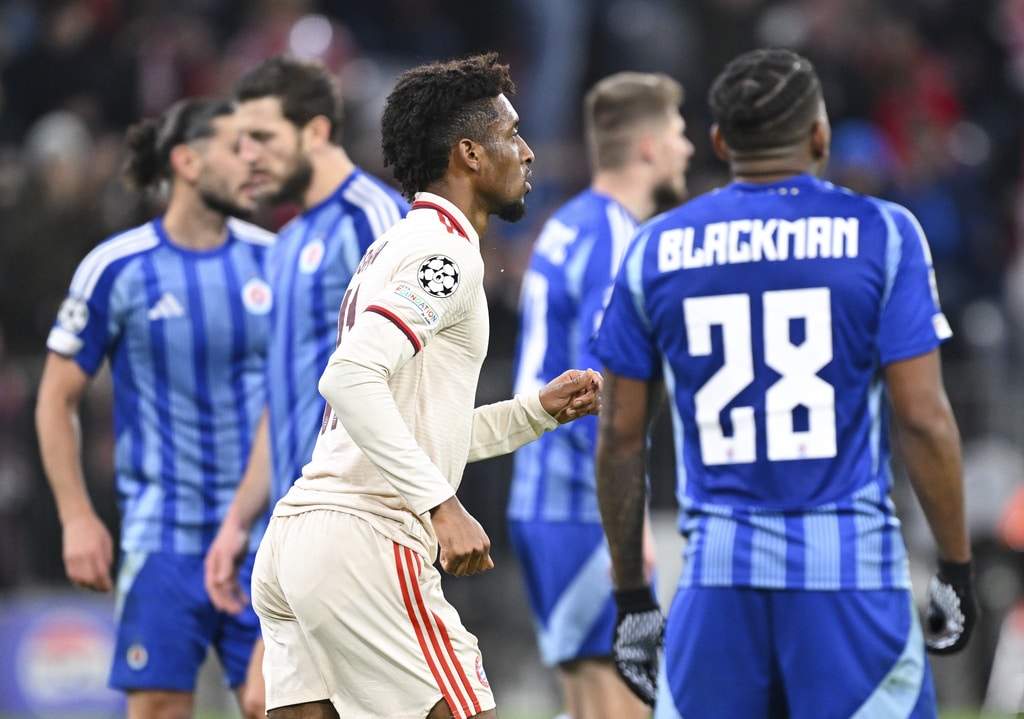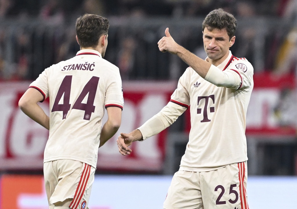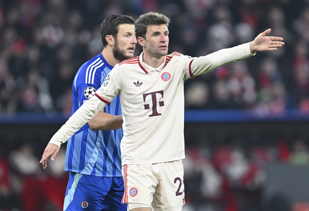 Bayern’s Thomas Muller, right, celebrates after scoring the opening goal with Josip Stanisic during the Champions League opening phase soccer match between Bayern Munich and Slovan Bratislava at the Allianz Arena in Munich, Germany, Jan. 29, 2025. (Sven Hoppe/dpa via AP)Munich’s Kingsley Coman, centre, celebrates after scoring his side’s third goal during the Champions League opening phase soccer match between Bayern Munich and Slovan Bratislava at the Allianz Arena in Munich, Germany, Jan. 29, 2025. (Sven Hoppe/dpa via AP)Munich’s Harry Kane, right, and Slovan’s Sharani Zuberu challenge for the ball during the Champions League opening phase soccer match between Bayern Munich and Slovan Bratislava at the Allianz Arena in Munich, Germany, Jan. 29, 2025. (Sven Hoppe/dpa via AP)Bayern’s Thomas Muller gestures during the Champions League opening phase soccer match between Bayern Munich and Slovan Bratislava at the Allianz Arena in Munich, Germany, Jan. 29, 2025. (Sven Hoppe/dpa via AP)Bayern’s Leroy Sane, left, and Slovan’s Kevin Wimmer challenge for the ball during the Champions League opening phase soccer match between Bayern Munich and Slovan Bratislava at the Allianz Arena in Munich, Germany, Jan. 29, 2025. (Sven Hoppe/dpa via AP)Bayern’s Thomas Muller controls the ball during the Champions League opening phase soccer match between Bayern Munich and Slovan Bratislava at the Allianz Arena in Munich, Germany, Jan. 29, 2025. (Sven Hoppe/dpa via AP)