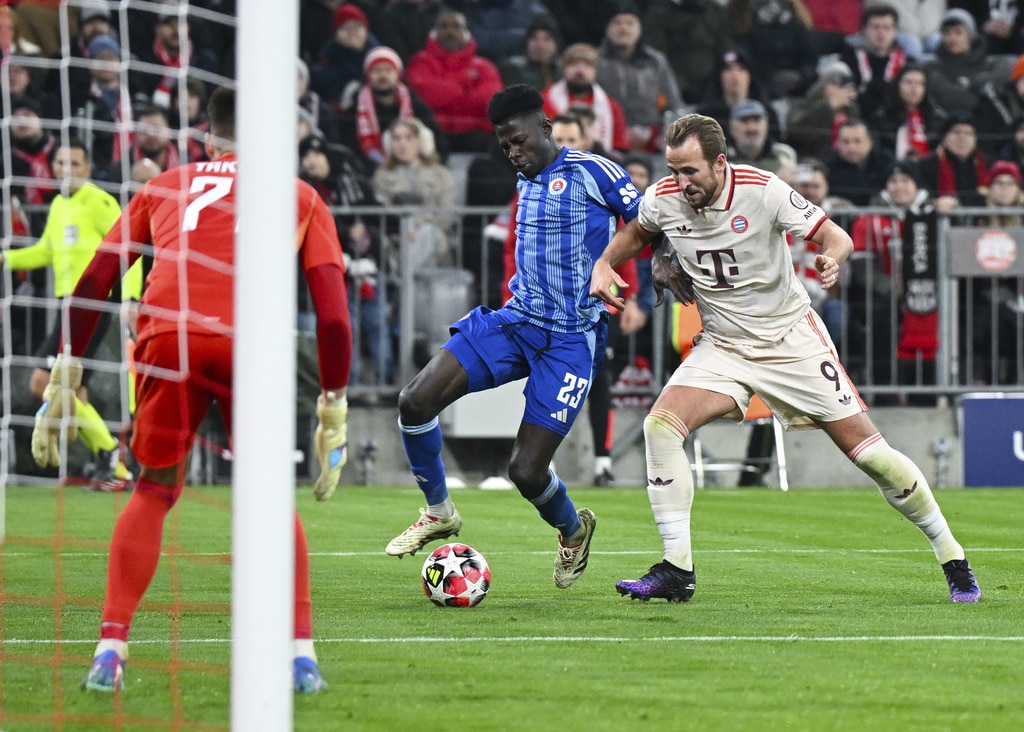 Bayern’s Jamal Musiala, right, and Slovan’s Kyriakos Savvidis challenge for the ball during the Champions League opening phase soccer match between Bayern Munich and Slovan Bratislava at the Allianz Arena in Munich, Germany, Jan. 29, 2025. (Sven Hoppe/dpa via AP)