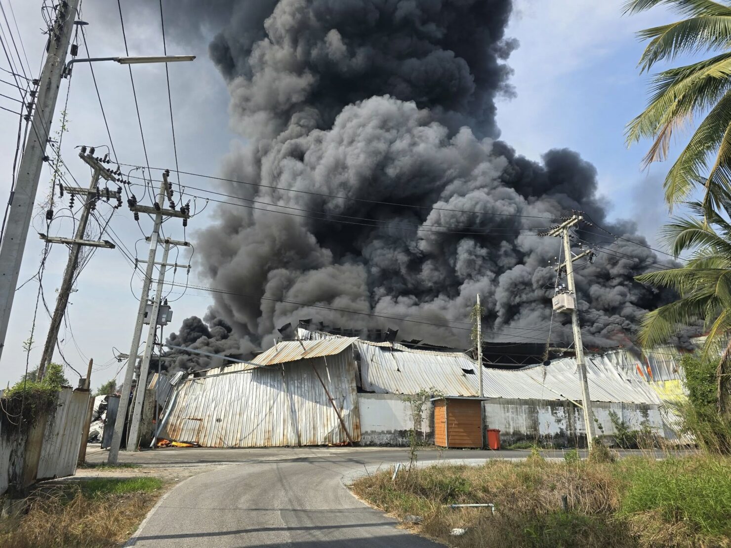 ไฟไหม้โรงงานสมุทรสาคร ตรวจสอบพบเป็นโรงงานลักษณะยางรองเท้า และพลาสติก เสียหายหนัก อาคารเอียง หวั่นโครงสร้างถล่ม
