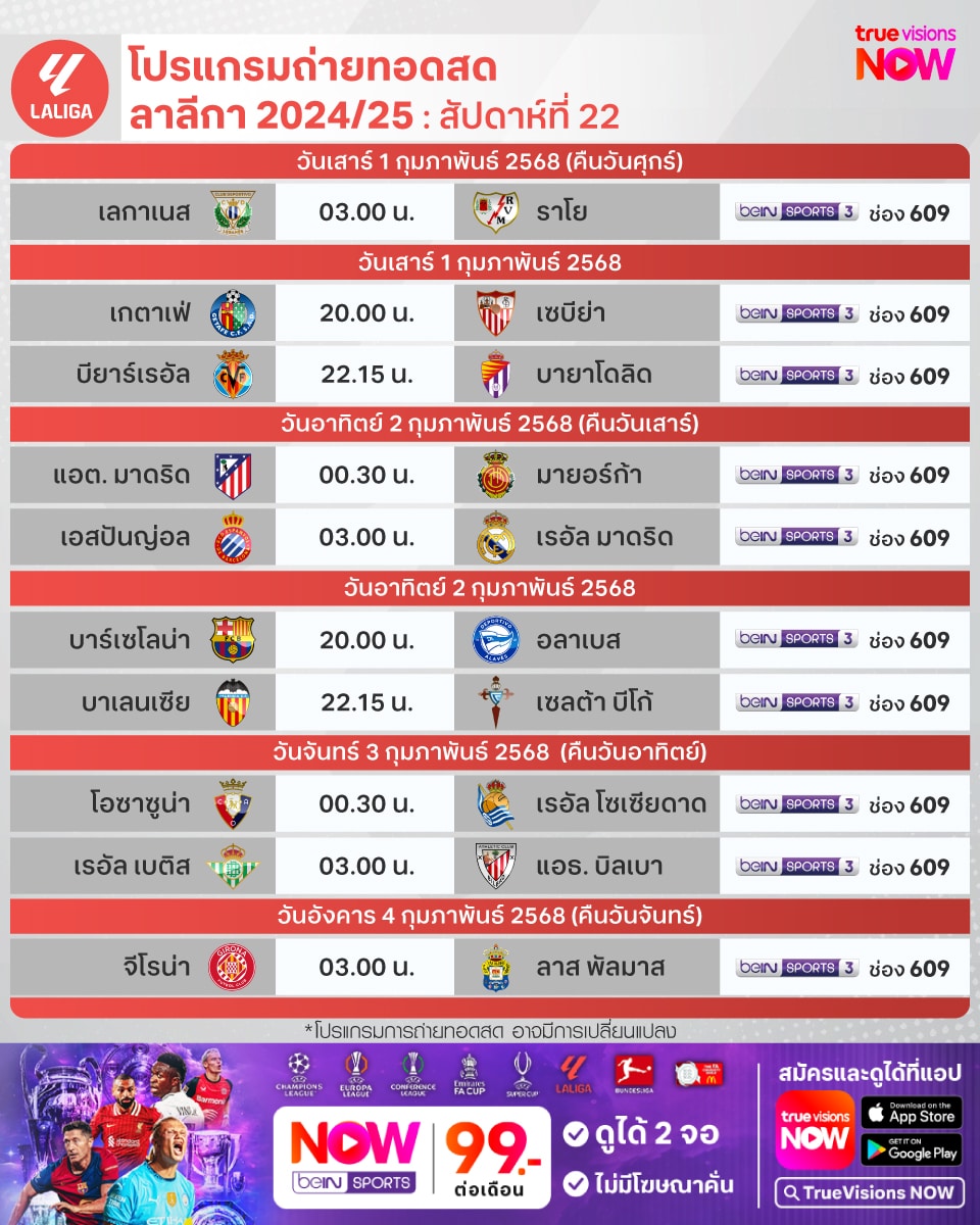 โปรแกรม ลาลีกา สเปน ประจำฤดูกาล 2024/25 สัปดาห์ที่ 22 ถ่ายทอดสดทางช่อง beIN Sport