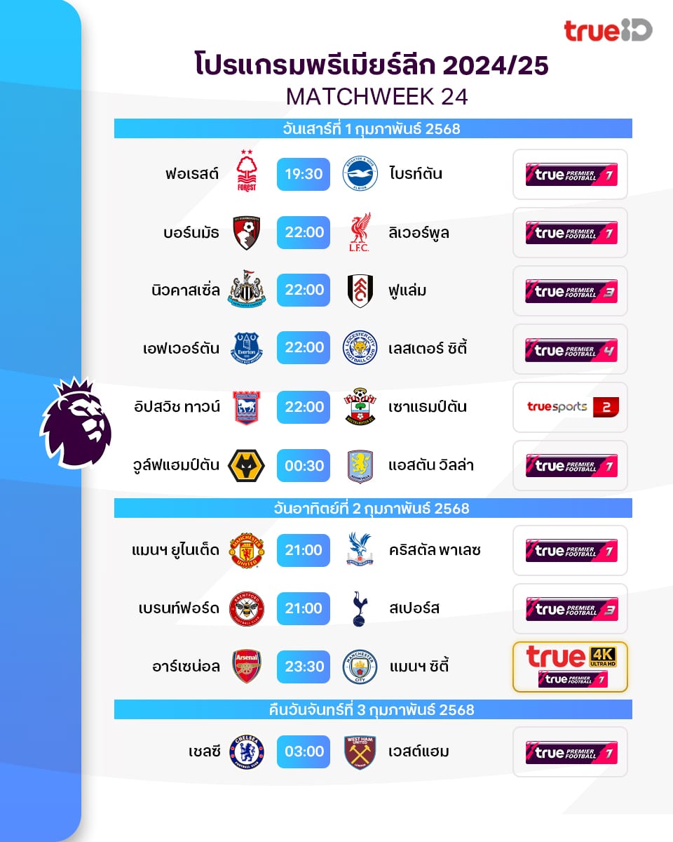 โปรแกรมพรีเมียร์ลีก 2024/25 สัปดาห์ที่ 24 แข่งวันที่ 1-3 ก.พ. นี้ ตารางแข่งพร้อมช่องดูบอลสด