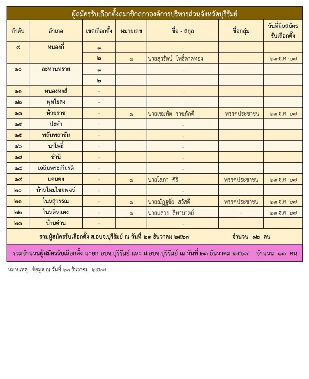 สำนักงานคณะกรรมการการเลือกตั้ง (กกต.) บุรีรัมย์ เผยแพร่รายชื่อและหมายเลขผู้สมัครรับเลือกตั้ง ผู้สมัคร ส.อบจ. 2568 ลงคะแนนเสียงวันที่ 1 กุมภาพันธ์ 2568 มีดังนี้