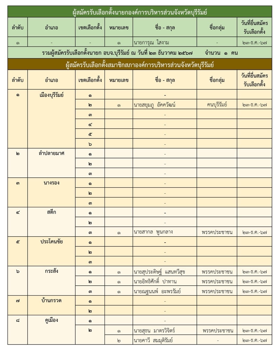 สำนักงานคณะกรรมการการเลือกตั้ง (กกต.) บุรีรัมย์ เผยแพร่รายชื่อและหมายเลขผู้สมัครรับเลือกตั้ง ผู้สมัคร ส.อบจ. 2568 ลงคะแนนเสียงวันที่ 1 กุมภาพันธ์ 2568 มีดังนี้