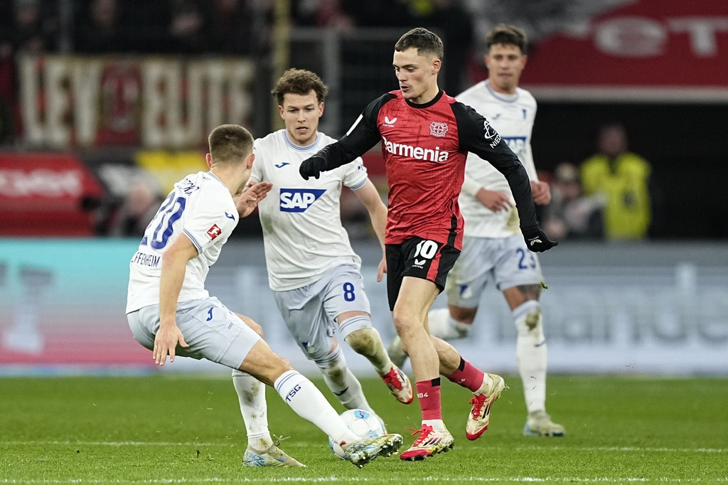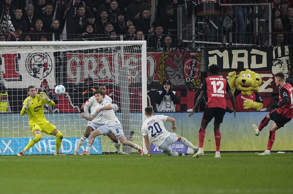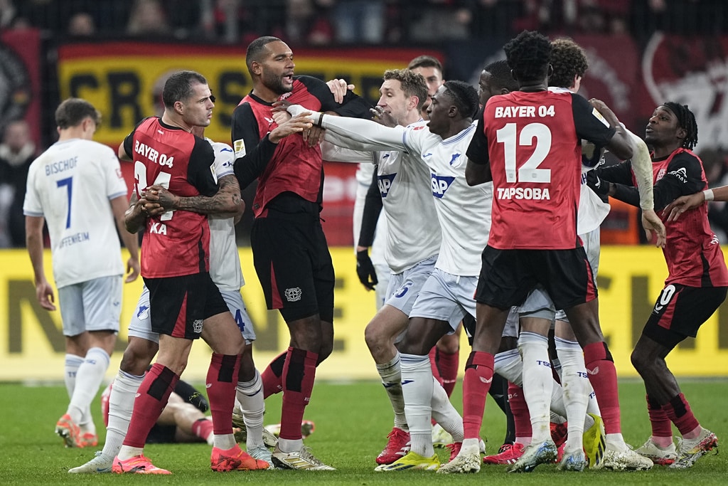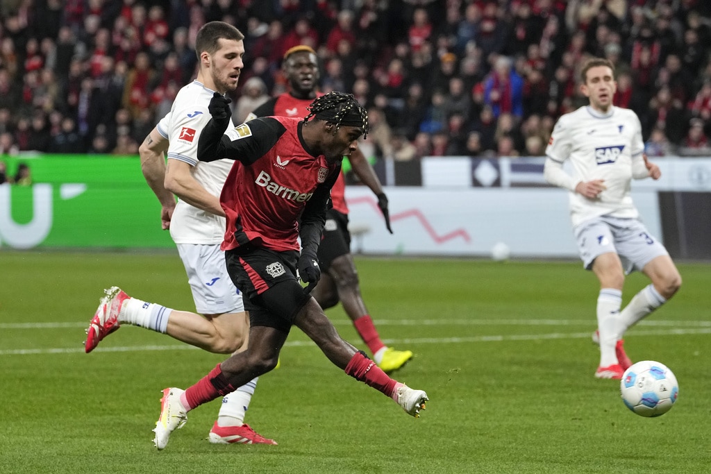 Leverkusen’s Jeremie Frimpong scores his side’s second goal during the German Bundesliga soccer match between Bayer Leverkusen and TSG Hoffenheim at the BayArena in Leverkusen, Germany, Sunday, Feb. 2, 2025. (AP Photo/Martin Meissner)Players fight after a foul on Leverkusen’s Florian Wirtz during the German Bundesliga soccer match between Bayer Leverkusen and TSG Hoffenheim at the BayArena in Leverkusen, Germany, Sunday, Feb. 2, 2025. (AP Photo/Martin Meissner)Leverkusen’s Patrik Schick, right, scores his side’s third goal during the German Bundesliga soccer match between Bayer Leverkusen and TSG Hoffenheim at the BayArena in Leverkusen, Germany, Sunday, Feb. 2, 2025. (AP Photo/Martin Meissner)Leverkusen’s Patrik Schick, right, celebrates with his team after scoring his side’s third goal during the German Bundesliga soccer match between Bayer Leverkusen and TSG Hoffenheim at the BayArena in Leverkusen, Germany, Sunday, Feb. 2, 2025. (AP Photo/Martin Meissner)Hoffenheim’s Gift Orban scores his side’s first goal against Leverkusen’s goalkeeper Lukas Hradecky during the German Bundesliga soccer match between Bayer Leverkusen and TSG Hoffenheim at the BayArena in Leverkusen, Germany, Sunday, Feb. 2, 2025. (AP Photo/Martin Meissner)Referee Robin Braun shows the red card to Leverkusen’s Alex Grimaldo during the German Bundesliga soccer match between Bayer Leverkusen and TSG Hoffenheim at the BayArena in Leverkusen, Germany, Sunday, Feb. 2, 2025. (AP Photo/Martin Meissner)Leverkusen’s Florian Wirtz and Hoffenheim’s Kevin Akpoguma challenge for the ball during the German Bundesliga soccer match between Bayer Leverkusen and TSG Hoffenheim at the BayArena in Leverkusen, Germany, Sunday, Feb. 2, 2025. (AP Photo/Martin Meissner)Leverkusen’s Florian Wirtz controls the ball during the German Bundesliga soccer match between Bayer Leverkusen and TSG Hoffenheim at the BayArena in Leverkusen, Germany, Sunday, Feb. 2, 2025. (AP Photo/Martin Meissner)Leverkusen’s Jeremie Frimpong, left, celebrates with Leverkusen’s Victor Boniface after he scored his side’s second goal during the German Bundesliga soccer match between Bayer Leverkusen and TSG Hoffenheim at the BayArena in Leverkusen, Germany, Sunday, Feb. 2, 2025. (AP Photo/Martin Meissner)