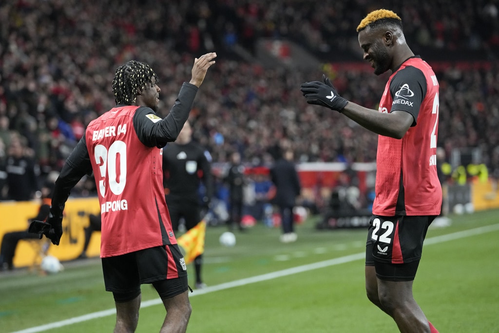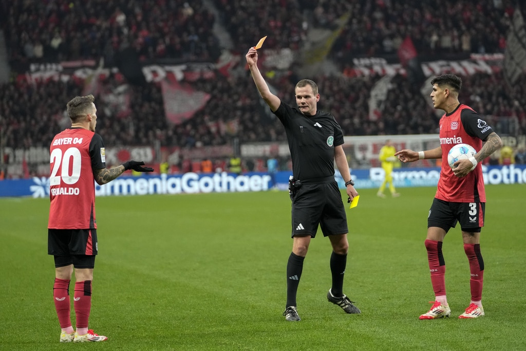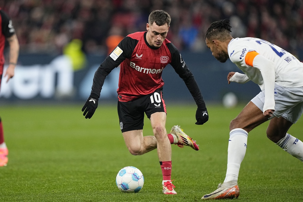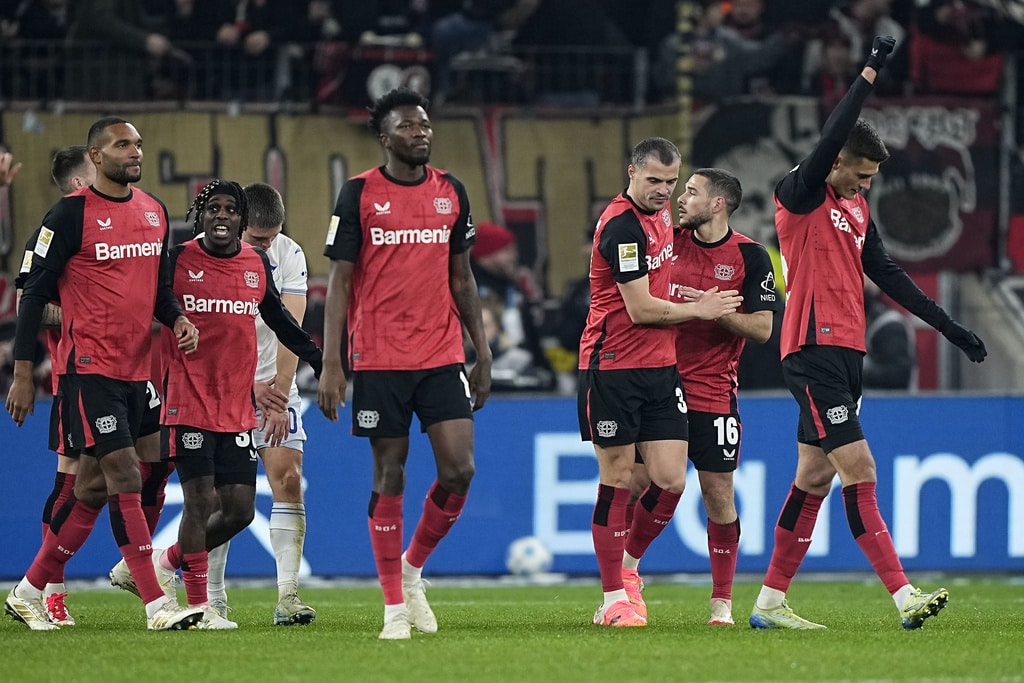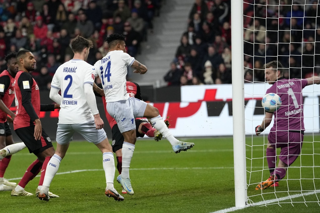 Leverkusen’s Jeremie Frimpong scores his side’s second goal during the German Bundesliga soccer match between Bayer Leverkusen and TSG Hoffenheim at the BayArena in Leverkusen, Germany, Sunday, Feb. 2, 2025. (AP Photo/Martin Meissner)Players fight after a foul on Leverkusen’s Florian Wirtz during the German Bundesliga soccer match between Bayer Leverkusen and TSG Hoffenheim at the BayArena in Leverkusen, Germany, Sunday, Feb. 2, 2025. (AP Photo/Martin Meissner)Leverkusen’s Patrik Schick, right, scores his side’s third goal during the German Bundesliga soccer match between Bayer Leverkusen and TSG Hoffenheim at the BayArena in Leverkusen, Germany, Sunday, Feb. 2, 2025. (AP Photo/Martin Meissner)Leverkusen’s Patrik Schick, right, celebrates with his team after scoring his side’s third goal during the German Bundesliga soccer match between Bayer Leverkusen and TSG Hoffenheim at the BayArena in Leverkusen, Germany, Sunday, Feb. 2, 2025. (AP Photo/Martin Meissner)Hoffenheim’s Gift Orban scores his side’s first goal against Leverkusen’s goalkeeper Lukas Hradecky during the German Bundesliga soccer match between Bayer Leverkusen and TSG Hoffenheim at the BayArena in Leverkusen, Germany, Sunday, Feb. 2, 2025. (AP Photo/Martin Meissner)Referee Robin Braun shows the red card to Leverkusen’s Alex Grimaldo during the German Bundesliga soccer match between Bayer Leverkusen and TSG Hoffenheim at the BayArena in Leverkusen, Germany, Sunday, Feb. 2, 2025. (AP Photo/Martin Meissner)Leverkusen’s Florian Wirtz and Hoffenheim’s Kevin Akpoguma challenge for the ball during the German Bundesliga soccer match between Bayer Leverkusen and TSG Hoffenheim at the BayArena in Leverkusen, Germany, Sunday, Feb. 2, 2025. (AP Photo/Martin Meissner)Leverkusen’s Florian Wirtz controls the ball during the German Bundesliga soccer match between Bayer Leverkusen and TSG Hoffenheim at the BayArena in Leverkusen, Germany, Sunday, Feb. 2, 2025. (AP Photo/Martin Meissner)Leverkusen’s Jeremie Frimpong, left, celebrates with Leverkusen’s Victor Boniface after he scored his side’s second goal during the German Bundesliga soccer match between Bayer Leverkusen and TSG Hoffenheim at the BayArena in Leverkusen, Germany, Sunday, Feb. 2, 2025. (AP Photo/Martin Meissner)