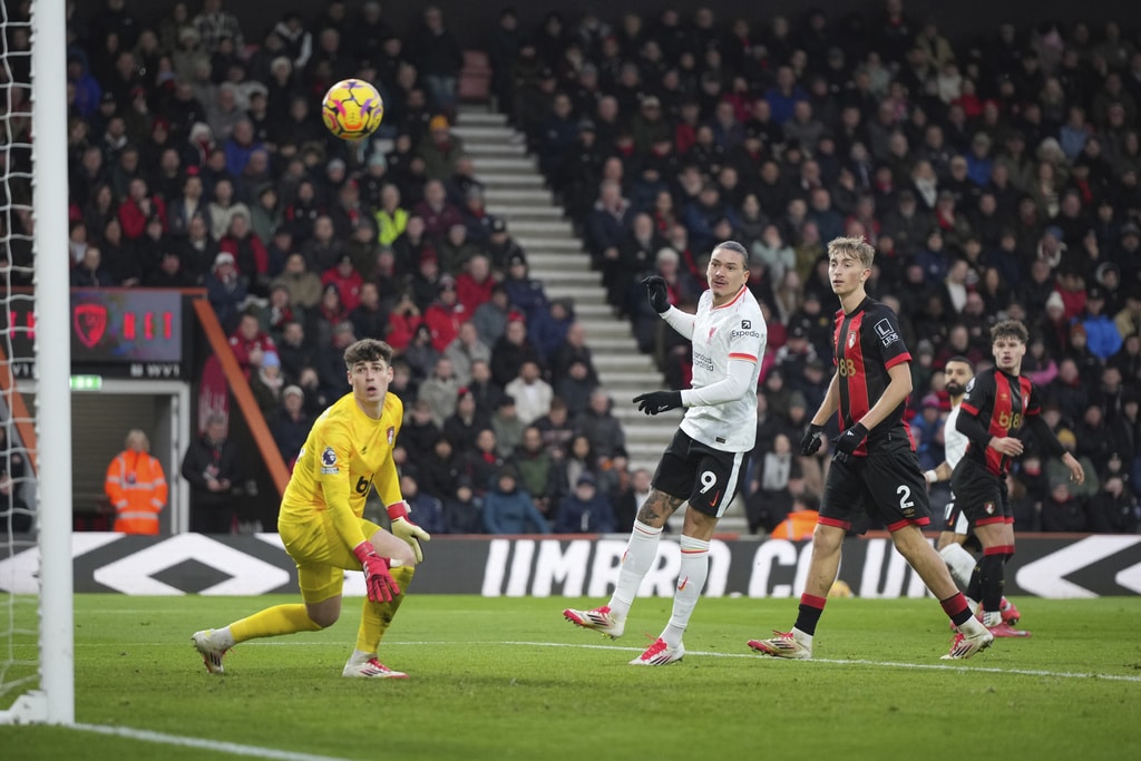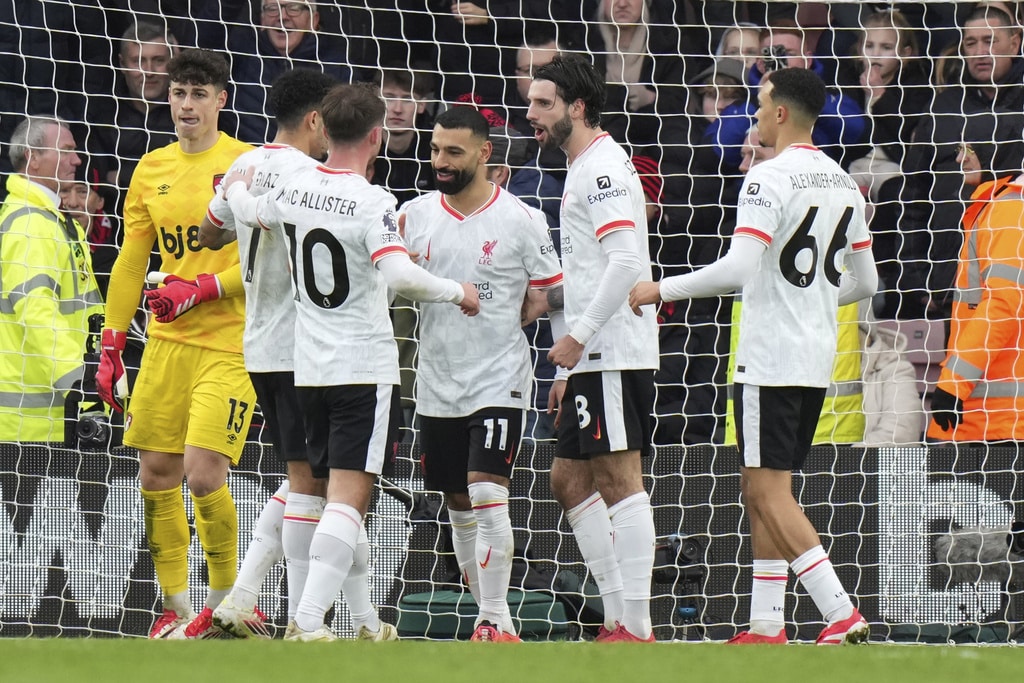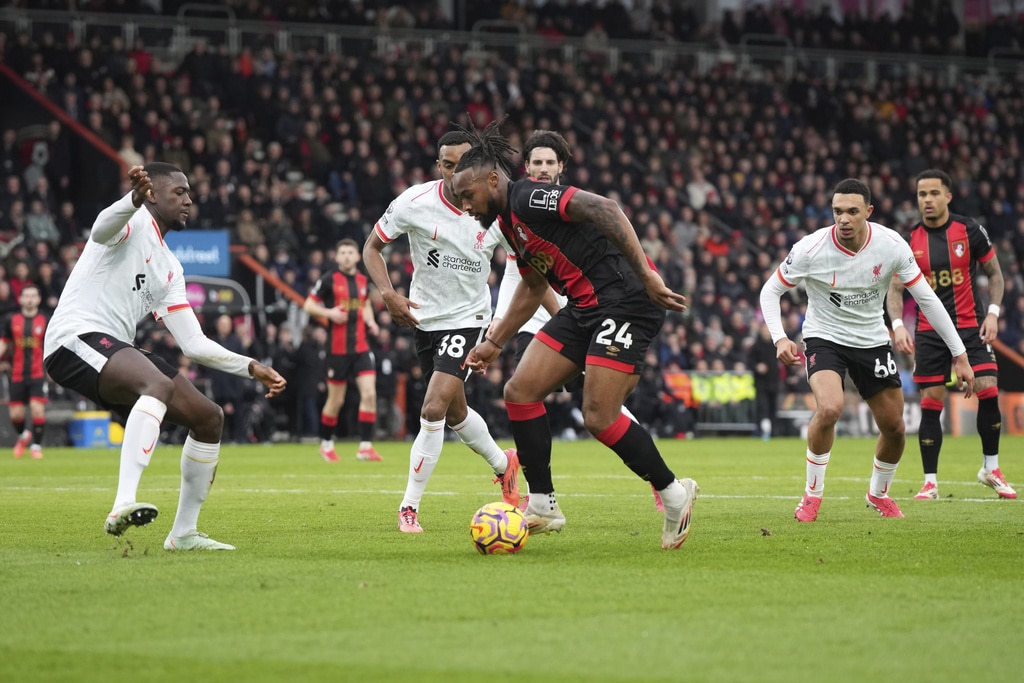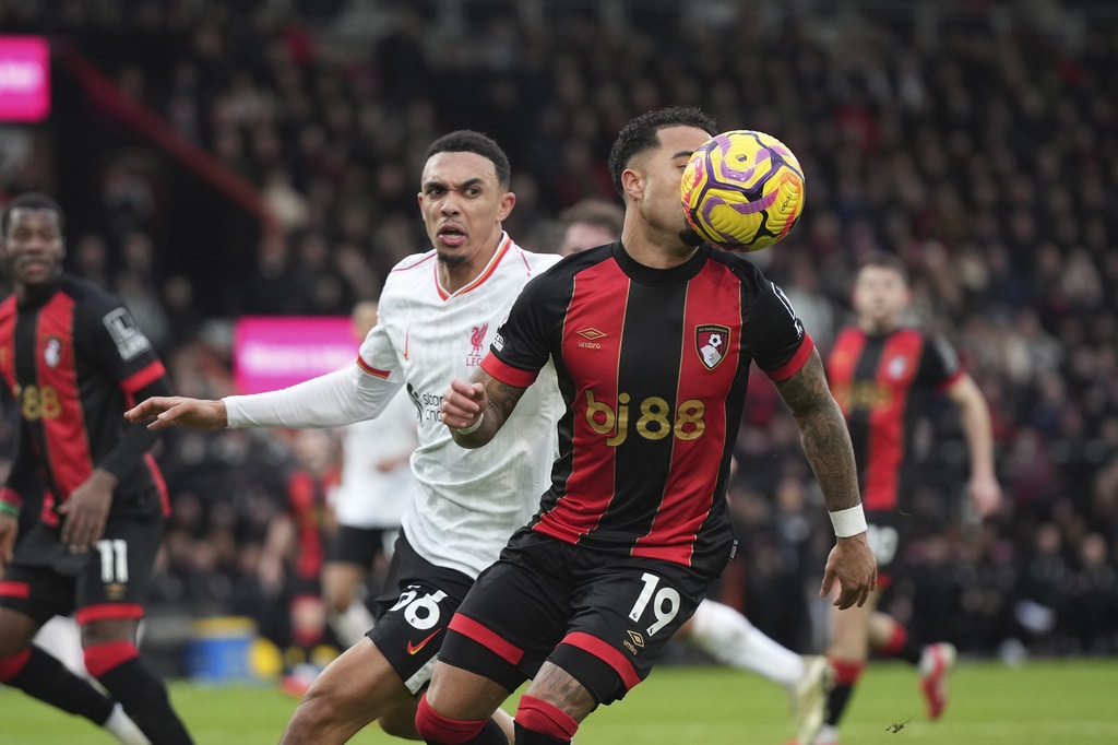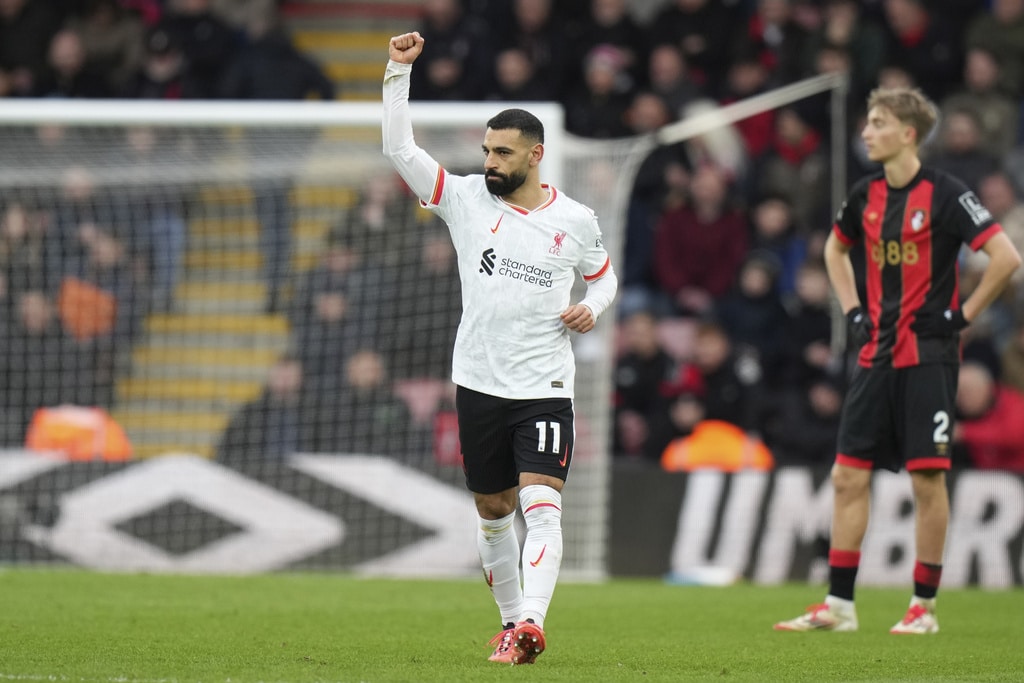 Liverpool’s Mohamed Salah, background right, scores his side’s second goal during the English Premier League soccer match between Bournemouth and Liverpool at the Vitality stadium in Bournemouth, England, Saturday, Feb. 1, 2025. (AP Photo/Alastair Grant)Bournemouth’s Justin Kluivert, right, views for the ball with Liverpool’s Trent Alexander-Arnold during the English Premier League soccer match between Bournemouth and Liverpool at the Vitality stadium in Bournemouth, England, Saturday, Feb. 1, 2025. (AP Photo/Alastair Grant)Liverpool’s Mohamed Salah, centre, celebrates with his teammates after scoring his side’s opening goal during the English Premier League soccer match between Bournemouth and Liverpool at the Vitality stadium in Bournemouth, England, Saturday, Feb. 1, 2025. (AP Photo/Alastair Grant)Liverpool’s Mohamed Salah celebrates after scoring his side’s opening goal during the English Premier League soccer match between Bournemouth and Liverpool at the Vitality stadium in Bournemouth, England, Saturday, Feb. 1, 2025. (AP Photo/Alastair Grant)Bournemouth’s Antoine Semenyo, centre, controls the ball during the English Premier League soccer match between Bournemouth and Liverpool at the Vitality stadium in Bournemouth, England, Saturday, Feb. 1, 2025. (AP Photo/Alastair Grant)Liverpool’s Mohamed Salah stands during the English Premier League soccer match between Bournemouth and Liverpool at the Vitality stadium in Bournemouth, England, Saturday, Feb. 1, 2025. (AP Photo/Alastair Grant)Liverpool’s Trent Alexander-Arnold stands during the English Premier League soccer match between Bournemouth and Liverpool at the Vitality stadium in Bournemouth, England, Saturday, Feb. 1, 2025. (AP Photo/Alastair Grant)