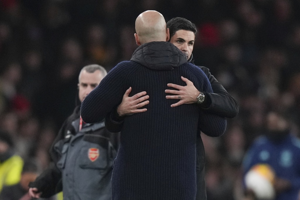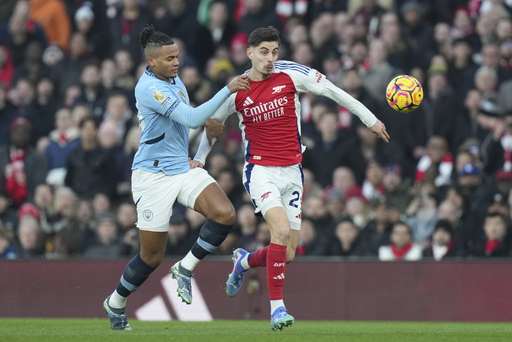 Arsenal’s Martin Odegaard celebrates scoring his side’s opening goal during the English Premier League soccer match between Arsenal and Manchester City at the Emirates stadium in London, Sunday, Feb. 2, 2025. (AP Photo/Alastair Grant)Arsenal’s Ethan Nwaneri, right, celebrates scoring his side’s 5th goal during the English Premier League soccer match between Arsenal and Manchester City at the Emirates stadium in London, Sunday, Feb. 2, 2025. (AP Photo/Alastair Grant)Arsenal’s manager Mikel Arteta, background, hugs Manchester City’s head coach Pep Guardiola at the end of the English Premier League soccer match between Arsenal and Manchester City at the Emirates stadium in London, Sunday, Feb. 2, 2025. (AP Photo/Alastair Grant)Manchester City’s Erling Haaland celebrates scoring his side’s first goal during the English Premier League soccer match between Arsenal and Manchester City at the Emirates stadium in London, Sunday, Feb. 2, 2025. (Adam Davy/PA via AP)Arsenal’s Leandro Trossard, left, and Manchester City’s Matheus Nunes vie for the ball during the English Premier League soccer match between Arsenal and Manchester City at the Emirates stadium in London, Sunday, Feb. 2, 2025. (AP Photo/Alastair Grant)Arsenal’s Declan Rice, right, tries to block a shot from Manchester City’s Mateo Kovacic during the English Premier League soccer match between Arsenal and Manchester City at the Emirates stadium in London, Sunday, Feb. 2, 2025. (AP Photo/Alastair Grant)Arsenal’s Kai Havertz, background, reacts after missing a chance to score during the English Premier League soccer match between Arsenal and Manchester City at the Emirates stadium in London, Sunday, Feb. 2, 2025. (AP Photo/Alastair Grant)Manchester City’s Manuel Akanji, left, and Arsenal’s Kai Havertz vie for the ball during the English Premier League soccer match between Arsenal and Manchester City at the Emirates stadium in London, Sunday, Feb. 2, 2025. (AP Photo/Alastair Grant)