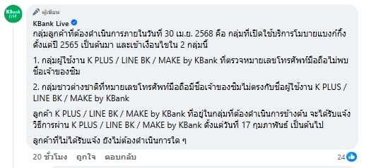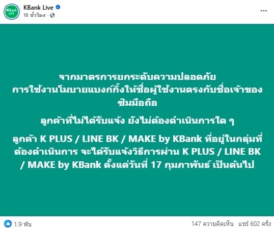 ลูกค้า K PLUS / LINE BK / MAKE by KBank ที่อยู่ในกลุ่มที่ต้องดำเนินการ จะได้รับแจ้งวิธีการผ่าน K PLUS / LINE BK / MAKE by KBank ตั้งแต่วันที่ 17 กุมภาพันธ์ เป็นต้นไป”