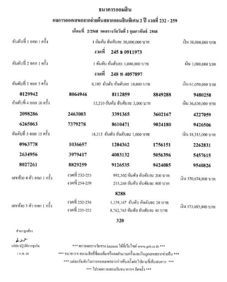 วันที่ 1 ก.พ. 68 ธนาคารออมสิน ประกาศผลการออกรางวัล งวดที่ 232-259 ประจำวันที่ 1 กุมภาพันธ์ 2568 โดยรางวัลที่ 1 มีมูลค่า 30,000,000 บาท ตรวจหวยออมสิน เลขที่ออก ได้แก่