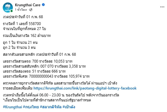 ล่าสุดทางเพจเฟซบุ๊ก Krungthai Care ได้ออกมารายงานว่าหวยงวดนี้ 1 ก.พ. 68 มีเศรษฐีคนใหม่ถูกรางวัลที่ 1 จากการซื้อสลากดิจิทัลในแอปฯ เป๋าตัง มากถึง 24 คน รวมเงินรางวัลทั้งหมด 27 ใบเป็นเงิน 162 ล้านบาท