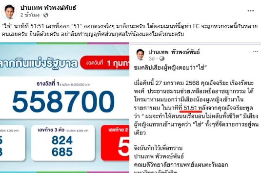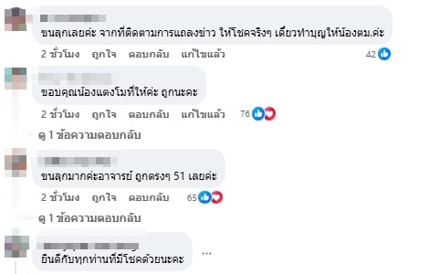 ทว่าสิ่งที่ฮือฮาไม่ใช่เพียงแค่เหล่าเศรษฐีเงินล้านประจำงวดนี้ แต่มันเป็นเรื่องที่ชวนขนลุกเมื่อ อ.ปานเทพ ได้ออกมาโพสต์ในเฟซบุ๊กระบุว่า ““ใช่” นาทีที่ 51:51 เลขที่ออก “51” ออกตรงจริงๆ มาอีกนะครับ ใต้คอมเมนท์นี้ดูท่า FC จะถูกหวยงวดนี้กันหลายคนเลยครับ ยินดีด้วยครับ อย่าลืมทำบุญอุทิศส่วนกุศลให้น้องแตงโมด้วยนะครับ”
