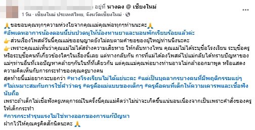 ทั้งนี้แม่ของเด็กชายป.3 ก็ยังได้มีการอัปเดตเพิ่มเติมเรื่อย ๆ ว่า มีผู้ใหญ่ท่านหนึ่งติดต่อมาให้ลบโพสต์ก่อนหน้านี้ แต่แม่เลือกที่จะไม่ลบ เพราะหลังจากโพสต์ไปแล้วจึงได้ทราบว่ามีเด็กคนอื่น ๆ ที่ถูกกระทำคล้าย ๆ กันในที่แห่งเดียวกัน แต่ในวันจันทร์ที่จะถึงนี้ทาง ผอ.โรงเรียนที่เกิดเหตุได้มีการติดต่อมาให้เข้าไปพูดคุยกันที่โรงเรียนในวันจันทร์ที่จะถึงนี้
