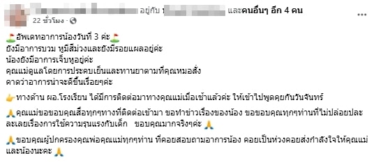 ทั้งนี้แม่ของเด็กชายป.3 ก็ยังได้มีการอัปเดตเพิ่มเติมเรื่อย ๆ ว่า มีผู้ใหญ่ท่านหนึ่งติดต่อมาให้ลบโพสต์ก่อนหน้านี้ แต่แม่เลือกที่จะไม่ลบ เพราะหลังจากโพสต์ไปแล้วจึงได้ทราบว่ามีเด็กคนอื่น ๆ ที่ถูกกระทำคล้าย ๆ กันในที่แห่งเดียวกัน แต่ในวันจันทร์ที่จะถึงนี้ทาง ผอ.โรงเรียนที่เกิดเหตุได้มีการติดต่อมาให้เข้าไปพูดคุยกันที่โรงเรียนในวันจันทร์ที่จะถึงนี้