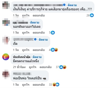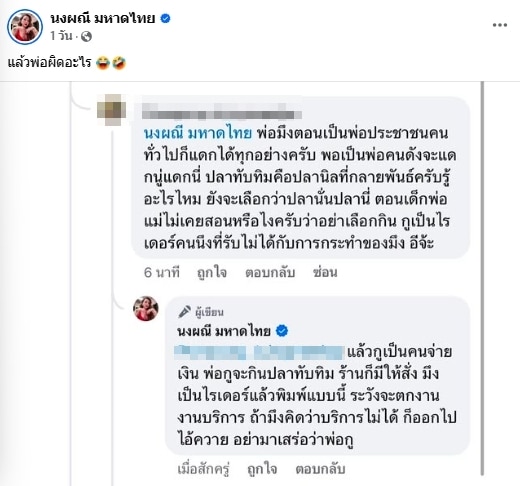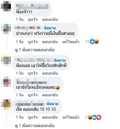 งานนี้ลูกทุ่งสาวไปยอมทนอยู่เงียบ ๆ คอมเมนต์ฟาดฝีปากกลับไปแบบทันควัน ชนิดที่ว่าคนอ่านต้องหน้าสั่นแน่ ๆ โดยระบุว่า “แล้ว..ู.เป็นคนจ่ายเงิน พ่อ..ู.จะกินปลาทับทิม ร้านก็มีให้สั่ง ..ึ.งเป็นไรเดอร์แล้วพิมพ์แบบนี้ ระวังจะตกงาน งานบริการ ถ้า..ึ.งคิดว่าบริการไม่ได้ก็ออกไป ไอ้ค..าย อย่ามาเสร่อว่าพ่อ..ู.”