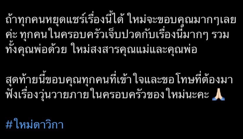 ถ้าทุกคนหยุดแชร์เรื่องนี้ได้ ใหม่จะขอบคุณมากๆเลยค่ะ ทุกคนในครอบครัวเจ็บปวดกับเรื่องนี้มากๆ รวมทั้งคุณพ่อด้วย ใหม่สงสารคุณแม่และคุณพ่อ