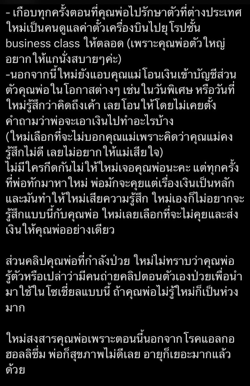 – นอกจากนี้ใหม่ยังแอบคุณแม่โอนเงินเข้าบัญชีส่วนตัวคุณพ่อในโอกาสต่างๆ เช่นในวันพิเศษ หรือวันที่ใหม่รู้สึกว่าคิดถึงเค้า เลยโอนให้โดยไม่เคยตั้งคำถามว่าพ่อจะเอาเงินไปทำอะไรบ้าง