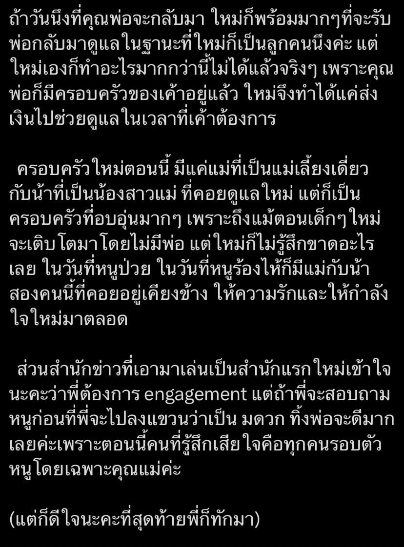 ส่วนสำนักข่าวที่เอามาเล่นเป็นสำนักแรกใหม่เข้าใจนะคะว่าพี่ต้องการ engagement แต่ถ้าพี่จะสอบถามหนูก่อนที่พี่จะไปลงแขวนว่าเป็น มดวก ทิ้งพ่อจะดีมากเลยค่ะเพราะตอนนี้คนที่รู้สึกเสียใจคือทุกคนรอบตัวหนูโดยเฉพาะคุณแม่ค่ะ (แต่ก็ดีใจนะคะที่สุดท้ายพี่ก็ทักมา)