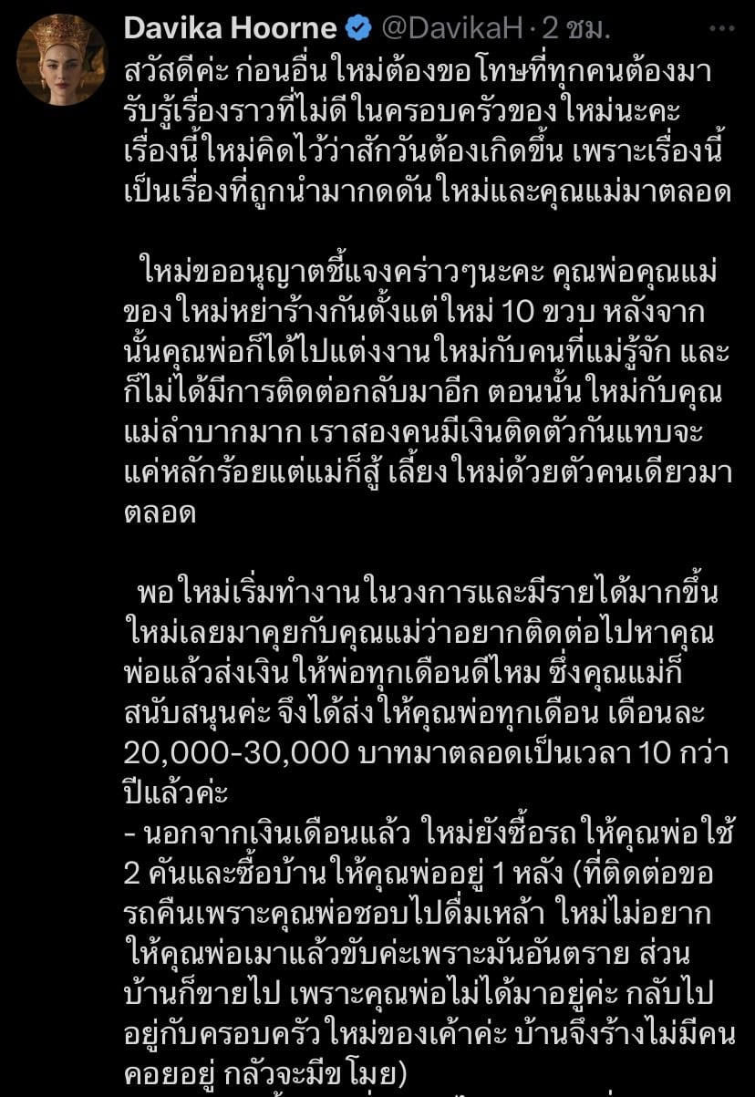 ใหม่ ดาวิกา โพสต์ชี้แจงละเอียดยิบ ปมดราม่า ไม่เลี้ยงดูพ่อ เจ้าตัวยืนยัน ส่งเงินให้ทุกเดือน เผยสาเหตุขอรถคืน-ขายบ้านทิ้ง วอนหยุดแชร์ข่าว กระทบจิตใจครอบครัว
