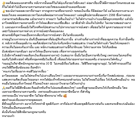 ขอเน้นว่าตลอดเวลาที่ผ่านมา หากลูกความหรือนายหน้า จะขอเงินเพิ่ม ก็ติดต่อมาได้ แต่ไม่เคยทวงถาม มาขออะไรเลย ตลอดระยะเวลาไม่เคยติดต่อมาทวงอะไรผมเลย!! แต่อยู่ดีๆปลายเดือนมกรา 2568 ซึ่งผ่านระยะเวลามาร่วม 6 เดือนเศษ แล้วมากล่าว หาผมว่า ไม่คืนเงินบ้าง? ไม่ได้ทำงานบ้าง? แบบนี้มันถูกเหรอครับ! แล้วยังมาโพสต์ข้อความหลายครั้ง ทำให้ผมเสียหายแก่ชื่อเสียง เอาดีเข้าตัว มันเกินไปครับ! ไม่เหมาะสมอย่างมาก
