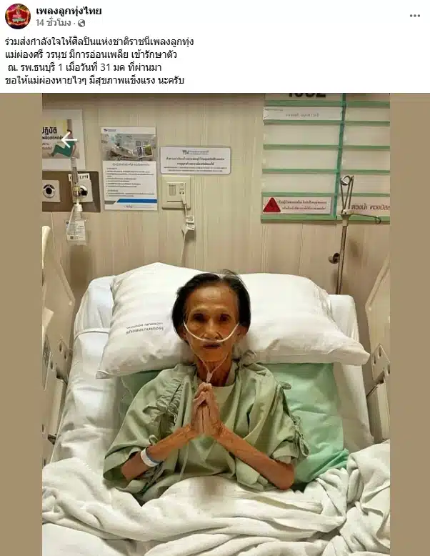 เพจดังแจ้งข่าว ผ่องศรี วรนุช ศิลปินแห่งชาติ และราชินีลูกทุ่ง ล้มป่วยกะทันหัน เข้ารับการรักษาตัวในโรงพยาบาล แฟนเพลงแห่ส่งกำลังใจให้กลับมาแข็งแรงในเร็ววัน