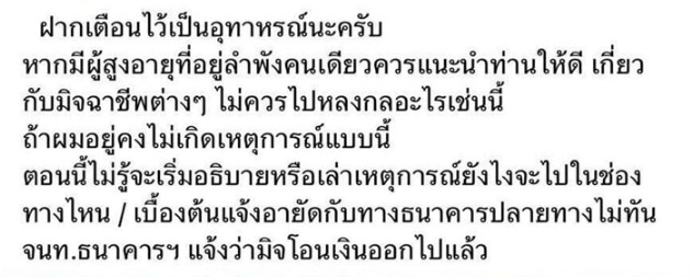 ขณะเดียวกันหลานชายของผู้เสียหายก็ได้มีการโพสต์เฟซบุ๊กเตือนภัยชาวเน็ตเอาไว้ด้วย โดยระบุข้อความว่า “ฝากเตือนไว้เป็นอุทาหรณ์นะครับ หากมีผู้สูงอายุที่อยู่ลำพังคนเดียว แนะนำท่านให้ดีเกี่ยวกับมิจฉาชีพต่าง ๆ ไม่ควรไปหลงกลอะไรเช่นนี้