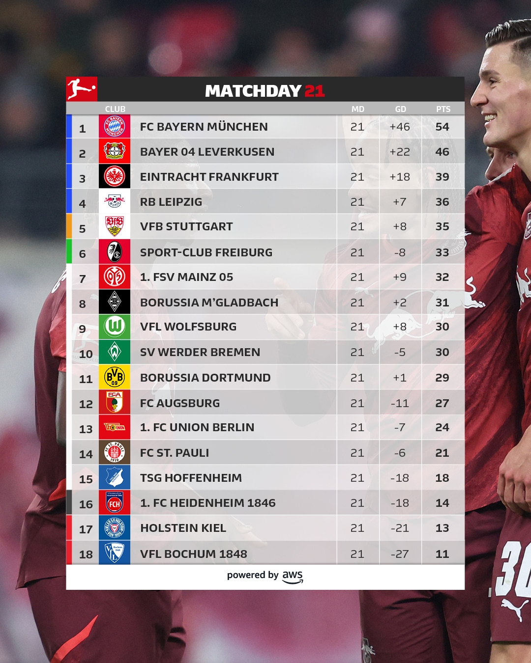 อันดับ ตารางคะแนน บุนเดสลีกา เยอรมัน 2024/25 หลังจบแมตซ์เดย์ที่ 21 โดย 5 อันดับเป็นไปตามลำดับมีดังนี้ (อัปเดตวันที่ 10 กุมภาพันธ์ 2568)