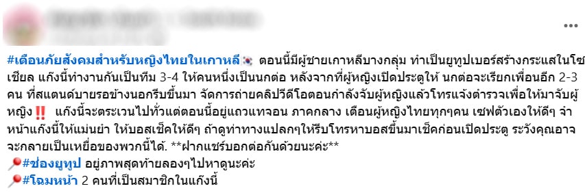 “#เตือนภัยสังคมสำหรับหญิงไทยในเกาหลี ตอนนี้มีผู้ชายเกาหลีบางกลุุ่ม ทำเป็นยูทูปเบอร์สร้างกระแสในโซเชียล แก๊งนี้ทำงานกันเป็นทีม 3-4 ให้คนหนึ่งเป็นนกต่อ หลังจากที่ผู้หญิงเปิดประตูให้ นกต่อจะเรียกเพื่อนอีก 2-3 คน ที่สแตนด์บายรอข้างนอกรีบขึ้นมา จัดการถ่ายคลิปวีดีโอตอนกำลังจับผู้หญิงแล้วโทรแจ้งตำรวจเพื่อให้มาจับผู้หญิง”