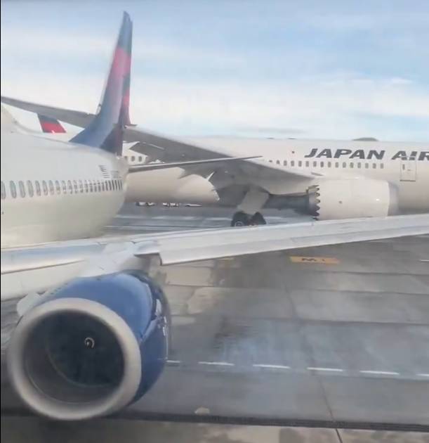 ปีกขวาของเครื่องบินสายการบินเจแปนแอร์ไลน์ เฉี่ยวชนหางเครื่องบินเดลต้าแอร์ไลน์ กลางสนามบินสหรัฐฯ โชคดีไร้คนเจ็บ สั่งสอบแล้ว