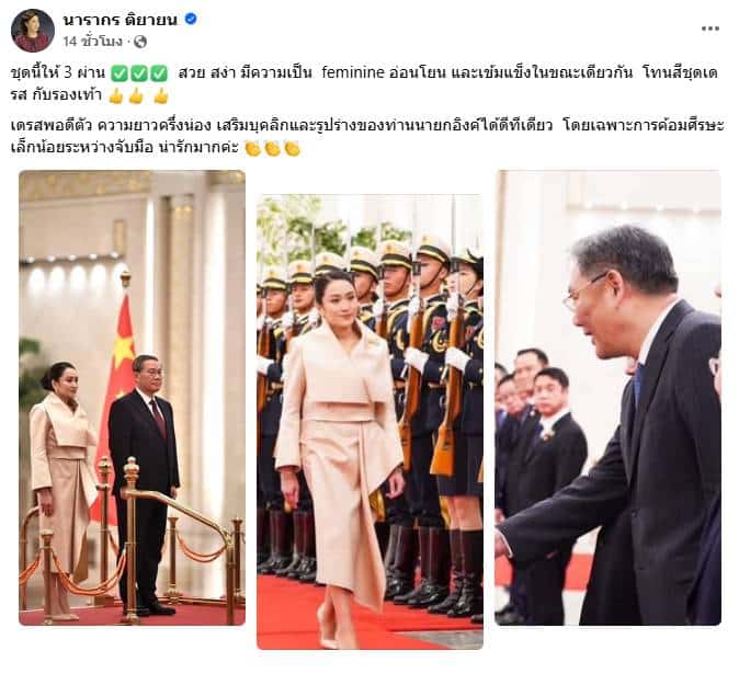 ล่าสุด ต๊ะ นารากร ติยายน พิธีกรได้โพสต์ข้อความเฟซบุ๊กพูดถึงการแต่งตัวนายกอิ๊งค์ โดยมีการกล่าวว่า “ชุดนี้ให้ 3 ผ่านสวย สง่า มีความเป็น feminine อ่อนโยน และเข้มแข็งในขณะเดียวกัน โทนสีชุดเดรส กับรองเท้า เดรสพอดีตัว ความยาวครึ่งน่อง เสริมบุคลิกและรูปร่างของท่านนายกอิงค์ได้ดีทีเดียว โดยเฉพาะการค้อมศีรษะเล็กน้อยระหว่างจับมือ น่ารักมากค่ะ”