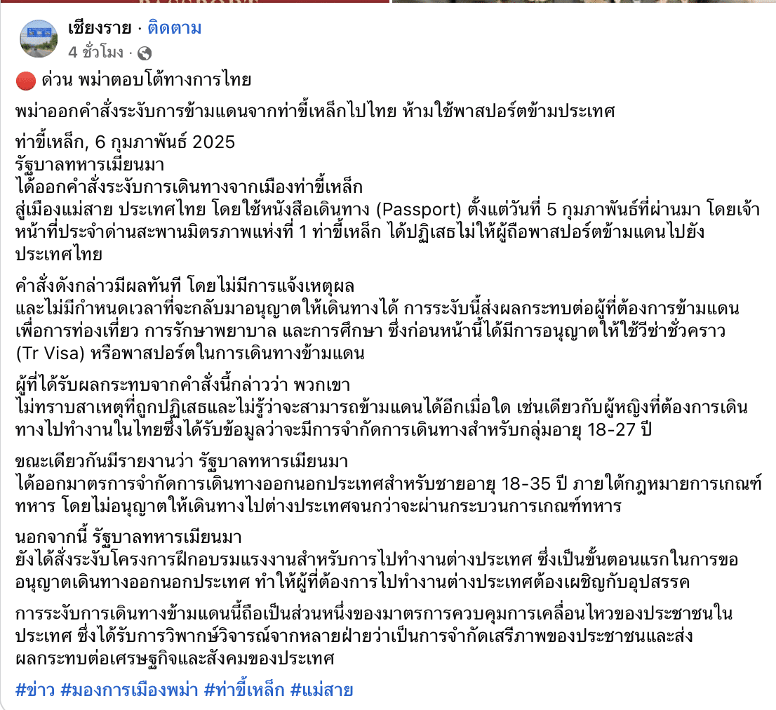 วันที่ 7 กุมภาพันธ์ 2568 มีรายงานว่า เพจเฟซบุ๊ก “เชียงราย” ได้ระบุว่า “ด่วน! พม่าตอบโต้ทางการไทย พม่าออกคำสั่งระงับการข้ามแดนจากท่าขี้เหล็กไปไทย ห้ามใช้พาสปอร์ตข้ามประเทศ ท่าขี้เหล็ก 6 ก.พ. 2025