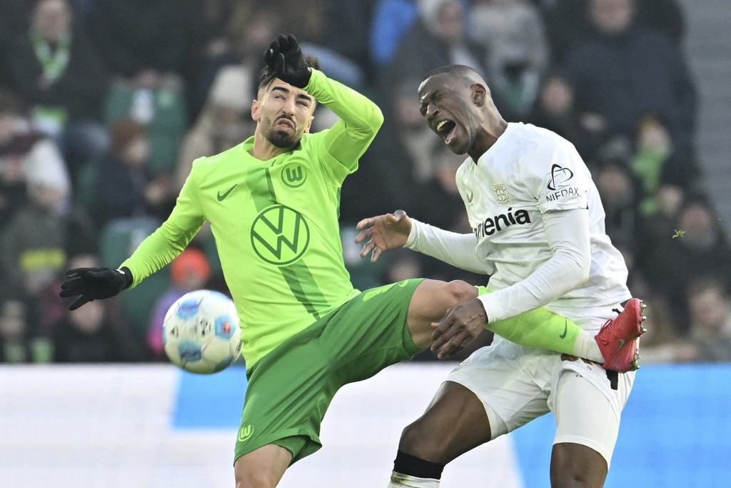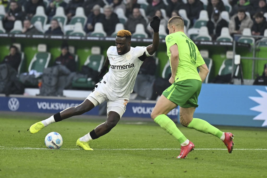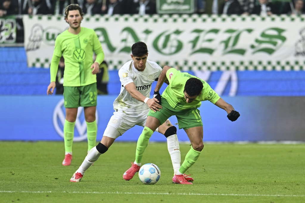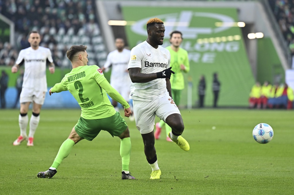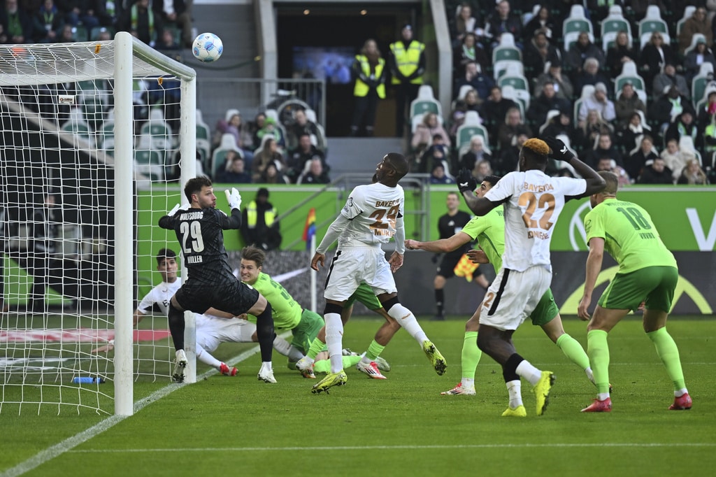 Wolfsburg’s Mohamed Amoura, left, plays against Leverkusen’s Nordi Mukiele during the German Bundesliga soccer match between VfL Wolfsburg and Bayer Leverkusen at the Volkswagen Arena in Wolfsburg, Germany, Saturday, Feb. 8, 2025. (Swen Pfortner/dpa via AP)Leverkusen’s Victor Boniface, left, plays against Wolfsburg’s Denis Vavro during the German Bundesliga soccer match between VfL Wolfsburg and Bayer Leverkusen at the Volkswagen Arena in Wolfsburg, Germany, Saturday, Feb. 8, 2025. (Swen Pfortner/dpa via AP)Wolfsburg’s Tiago Tomas, right, plays against Leverkusen’s Piero Hincapie during the German Bundesliga soccer match between VfL Wolfsburg and Bayer Leverkusen at the Volkswagen Arena in Wolfsburg, Germany, Saturday, Feb. 8, 2025. (Swen Pfortner/dpa via AP)Leverkusen’s Nordi Mukiele, center, heads towards Wolfsburg goalkeeper Marius Mueller’s goal during the German Bundesliga soccer match between VfL Wolfsburg and Bayer Leverkusen at the Volkswagen Arena in Wolfsburg, Germany, Saturday, Feb. 8, 2025. (Swen Pfortner/dpa via AP)Leverkusen’s Victor Boniface, right, plays against Wolfsburg’s Kilian Fischer during the German Bundesliga soccer match between VfL Wolfsburg and Bayer Leverkusen at the Volkswagen Arena in Wolfsburg, Germany, Saturday, Feb. 8, 2025. (Swen Pfortner/dpa via AP)