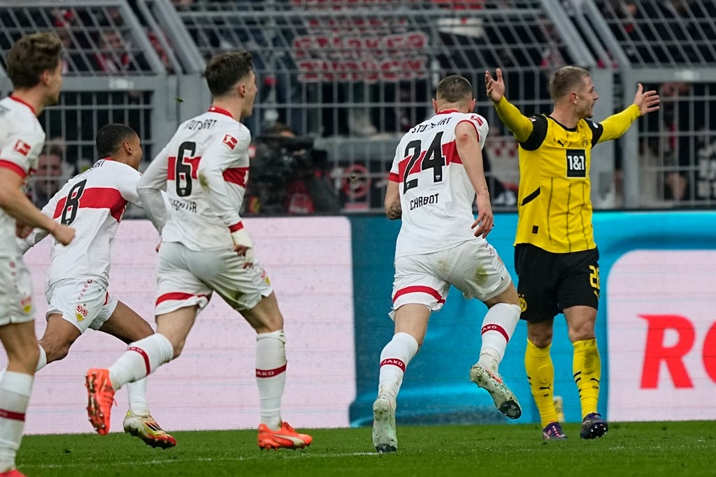 Dortmund’s Pascal Gross, left, challenges for the ball with Stuttgart’s Jamie Leweling during the German Bundesliga soccer match between Borussia Dortmund and VfB Stuttgart at the Signal-Iduna Park in Dortmund, Germany, Saturday, Feb. 8, 2025. (AP Photo/Martin Meissner)Dortmund’s head coach Nico Kovac argues with referee Daniel Siebert at the end of the German Bundesliga soccer match between Borussia Dortmund and VfB Stuttgart at the Signal-Iduna Park in Dortmund, Germany, Saturday, Feb. 8, 2025. (AP Photo/Martin Meissner)Dortmund players stand on the pitch at the end of the German Bundesliga soccer match between Borussia Dortmund and VfB Stuttgart at the Signal-Iduna Park in Dortmund, Germany, Saturday, Feb. 8, 2025. (AP Photo/Martin Meissner)Dortmund’s Serhou Guirassy challenges for the ball with Stuttgart’s Leonidas Stergiou during the German Bundesliga soccer match between Borussia Dortmund and VfB Stuttgart at the Signal-Iduna Park in Dortmund, Germany, Saturday, Feb. 8, 2025. (AP Photo/Martin Meissner)Dortmund’s Julian Ryerson, receives a red card, left, and his teammate Dortmund’s Emre Can react with referee Daniel Siebert during the German Bundesliga soccer match between Borussia Dortmund and VfB Stuttgart at the Signal-Iduna Park in Dortmund, Germany, Saturday, Feb. 8, 2025. (AP Photo/Martin Meissner)Stuttgart’s Angelo Stiller goes for the header with Dortmund’s Pascal Gross during the German Bundesliga soccer match between Borussia Dortmund and VfB Stuttgart at the Signal-Iduna Park in Dortmund, Germany, Saturday, Feb. 8, 2025. (AP Photo/Martin Meissner)Stuttgart’s Jeff Chabot celebrates after scoring his side’s second goal during the German Bundesliga soccer match between Borussia Dortmund and VfB Stuttgart at the Signal-Iduna Park in Dortmund, Germany, Saturday, Feb. 8, 2025. (AP Photo/Martin Meissner)Dortmund’s Karim Adeyemi receives a jellow card by referee Daniel Siebert during the German Bundesliga soccer match between Borussia Dortmund and VfB Stuttgart at the Signal-Iduna Park in Dortmund, Germany, Saturday, Feb. 8, 2025. (AP Photo/Martin Meissner)