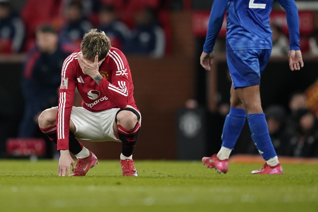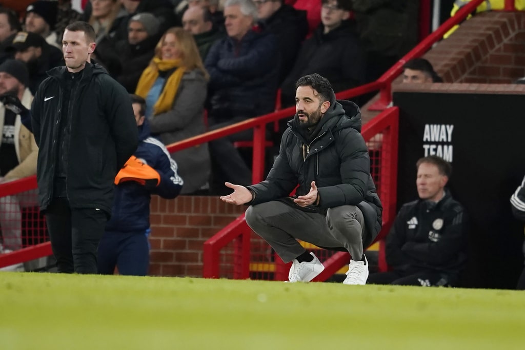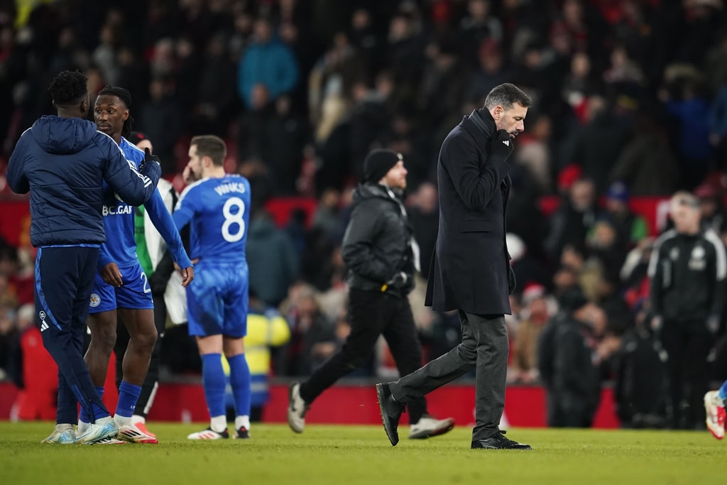 Manchester United’s head coach Ruben Amorim reacts after Leicester’s Bobby Decordova-Reid scored the opening goal during the English FA Cup fourth round soccer match between Manchester United and Leicester City at the Old Trafford stadium in Manchester, England, Friday, Feb. 7, 2025. (AP Photo/Dave Thompson)Manchester United’s Harry Maguire celebrates after the English FA Cup fourth round soccer match between Manchester United and Leicester City at the Old Trafford stadium in Manchester, England, Friday, Feb. 7, 2025. (AP Photo/Dave Thompson)Leicester’s head coach Ruud van Nistelrooy, right, leaves the pitch after the English FA Cup fourth round soccer match between Manchester United and Leicester City at the Old Trafford stadium in Manchester, England, Friday, Feb. 7, 2025. (AP Photo/Dave Thompson)Manchester United’s Alejandro Garnacho reacts during the English FA Cup fourth round soccer match between Manchester United and Leicester City at the Old Trafford stadium in Manchester, England, Friday, Feb. 7, 2025. (AP Photo/Dave Thompson)Manchester United’s Joshua Zirkzee celebrates after scoring his side’s first goal during the English FA Cup fourth round soccer match between Manchester United and Leicester City at the Old Trafford stadium in Manchester, England, Friday, Feb. 7, 2025. (AP Photo/Dave Thompson)Leicester’s Bobby Decordova-Reid, centre right, celebrates with Leicester’s Wilfred Ndidi after scoring the opening goal during the English FA Cup fourth round soccer match between Manchester United and Leicester City at the Old Trafford stadium in Manchester, England, Friday, Feb. 7, 2025. (AP Photo/Dave Thompson)