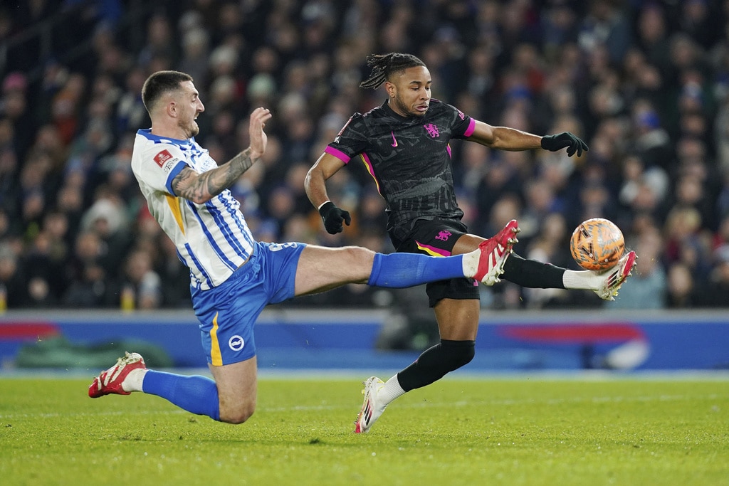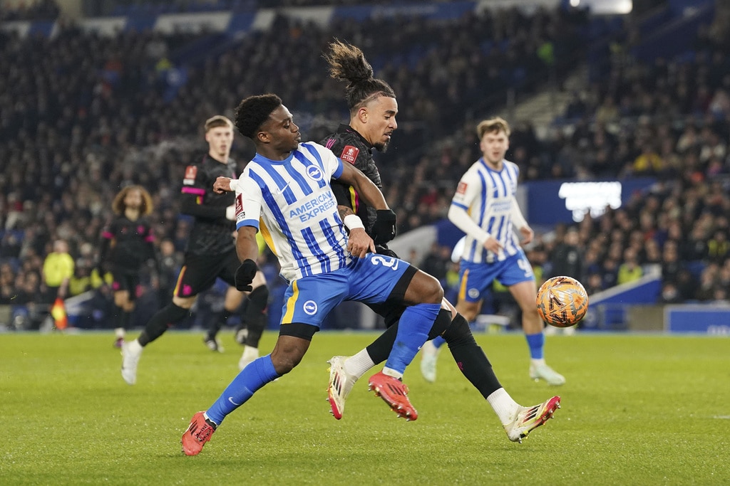 Brighton and Hove Albion’s Tariq Lamptey, left, and Chelsea’s Malo Gusto battle for the ball during the English FA Cup fourth round soccer match between Brighton & Hove Albion and Chelsea at American Express Stadium, Brighton, England, Saturday Feb. 8, 2025. (Gareth Fuller/PA via AP)Brighton and Hove Albion’s Lewis Dunk, left, and Chelsea’s Christopher Nkunku battle for the ball during the English FA Cup fourth round soccer match between Brighton & Hove Albion and Chelsea at American Express Stadium, Brighton, England, Saturday Feb. 8, 2025. (Gareth Fuller/PA via AP)Brighton and Hove Albion’s Kaoru Mitoma celebrates scoring their side’s second goal of the gamel during the English FA Cup fourth round soccer match between Brighton & Hove Albion and Chelsea at American Express Stadium, Brighton, England, Saturday Feb. 8, 2025. (Gareth Fuller/PA via AP)