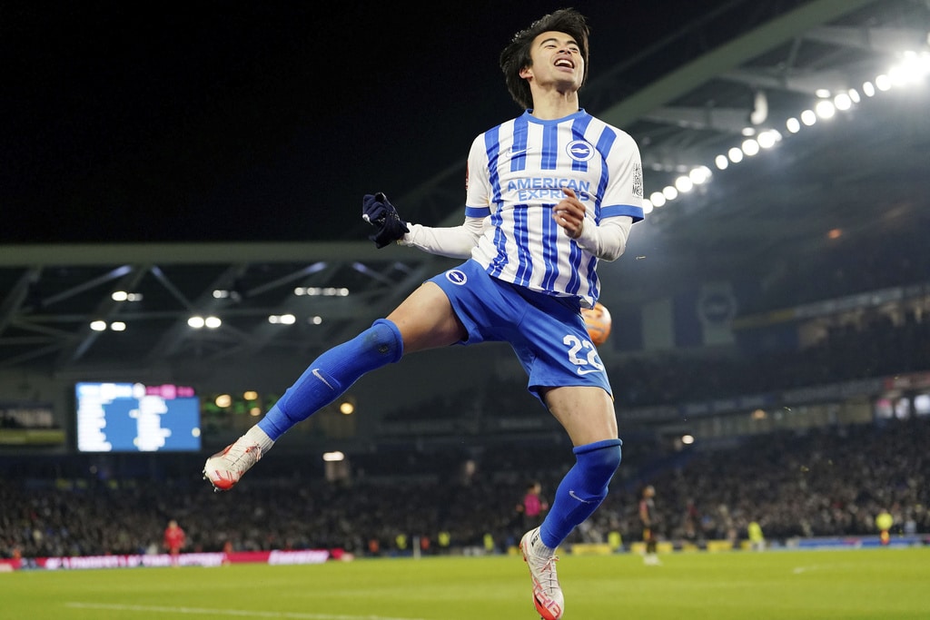Brighton and Hove Albion’s Kaoru Mitoma, left, scores their side’s second goal of the gamel during the English FA Cup fourth round soccer match between Brighton & Hove Albion and Chelsea at American Express Stadium, Brighton, England, Saturday Feb. 8, 2025. (Gareth Fuller/PA via AP)