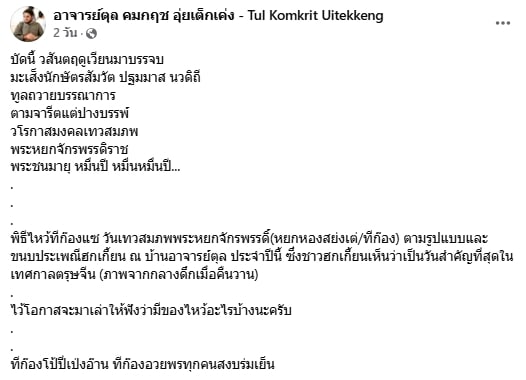 เมื่อเข้าไปดูในเฟซบุ๊กของ อาจารย์ตุล คมกฤช อุ่ยเต็กเค่ง – Tul Komkrit Uitekkeng ก็ได้พบว่า โพสต์สุดท้ายเพิ่งอัปโหลดลงเมื่อวันที่ 7 กุมภาพันธ์ 2568 เป็นภาพเกี่ยวกับ พิธีไหว้ทีก๊องแซ ตามรูปแบบและขนบประเพณีฮกเกี้ยน ซึ่งเป็นการให้ความรู้ครั้งสุดท้ายก่อนเสียชีวิตเพียงแค่ 1 วันเท่านั้น ทว่าเขาก็ยังทิ้งท้ายเอาไว้ว่าจะมาเล่าอย่างละเอียดอีกครั้งเกี่ยวกับของที่ใช้ไหว้ แต่ก็ไม่มีโอกาสนั้นอีกแล้ว