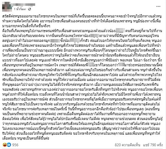 เมื่อวานหนูเลยยอมให้สัมภาษณ์กับเพจพี่กัน จอมพลังค่ะ เพราะหนูทักหาเขาเองค่ะว่าอยากออกมาขอโทษกับสิ่งที่หนูทำไปจริงๆค่ะ หนูอยากขอโทษเพื่อนๆหนูด้วยทำที่ให้เดือดร้อน รวมถึงคนที่โดนน้ำร้อนสาดว่าหนูช่วยไม่ได้จริงๆเพราะไม่มีใครห้ามพี่เขาได้เพราะหนูเองยอมรับว่าอยู่ในเหตุการณ์ค่ะ