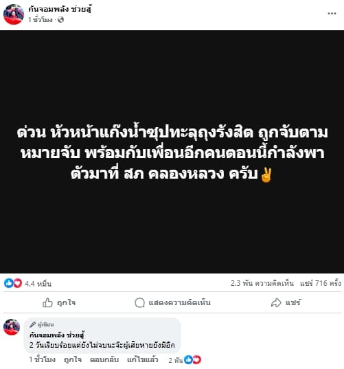 ขณะที่ทางเพจเฟซบุ๊ก กันจอมพลัง ช่วยสู้ ก็ได้เผยความคืบหน้าเกี่ยวกับกรณีนี้เช่นกัน ระบุว่า “ด่วน หัวหน้าแก๊งน้ำซุปทะลุถุงรังสิต ถูกจับตามหมายจับ พร้อมกับเพื่อนอีกคนตอนนี้กำลังพาตัวมาที่ สภ คลองหลวง ครับ 2 วันเรียบร้อยแต่ยังไม่จบนะจ๊ะผู้เสียหายยังมีอีก”