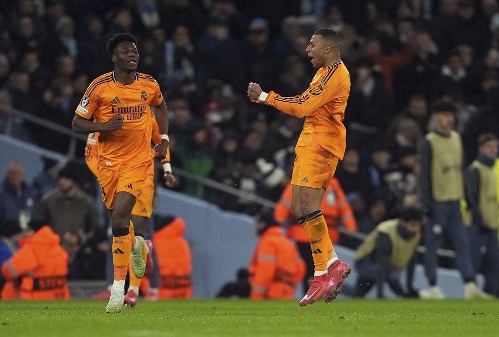 Manchester City’s Erling Haaland, left, celebrates with Manchester City’s Josko Gvardiol after scoring his sides first goal during the Champions League playoff first leg soccer match between Manchester City and Real Madrid at the Etihad Stadium in Manchester, England, Tuesday, Feb. 11, 2025. (AP Photo/Dave Thompson)Real Madrid’s Jude Bellingham, right, celebrates with Real Madrid’s Brahim Diaz after scoring his sides third goal during the Champions League playoff first leg soccer match between Manchester City and Real Madrid at the Etihad Stadium in Manchester, England, Tuesday, Feb. 11, 2025. (AP Photo/Dave Thompson)Real Madrid’s Jude Bellingham, right, celebrates with teammates after scoring his sides third goal during the Champions League playoff first leg soccer match between Manchester City and Real Madrid at the Etihad Stadium in Manchester, England, Tuesday, Feb. 11, 2025. (AP Photo/Dave Thompson)Real Madrid’s Vinicius Junior celebrates after his teammate Real Madrid’s Brahim Diaz scored their side second goal during the Champions League playoff first leg soccer match between Manchester City and Real Madrid at the Etihad Stadium in Manchester, England, Tuesday, Feb. 11, 2025. (AP Photo/Dave Thompson)Manchester City’s Erling Haaland scores his side’s second goal from the penalty spot during the Champions League playoff first leg soccer match between Manchester City and Real Madrid at the Etihad Stadium in Manchester, England, Tuesday, Feb. 11, 2025. (AP Photo/Darren Staples)Real Madrid’s Kylian Mbappe, right, celebrates after socring his sides first goal during the Champions League playoff first leg soccer match between Manchester City and Real Madrid at the Etihad Stadium in Manchester, England, Tuesday, Feb. 11, 2025. (Martin Rickett/PA via AP)Real Madrid’s Kylian Mbappe, left, celebrates with Real Madrid’s Jude Bellingham after socring his sides first goal during the Champions League playoff first leg soccer match between Manchester City and Real Madrid at the Etihad Stadium in Manchester, England, Tuesday, Feb. 11, 2025. (AP Photo/Dave Thompson)Real Madrid’s Kylian Mbappe scores his sides first goal during the Champions League playoff first leg soccer match between Manchester City and Real Madrid at the Etihad Stadium in Manchester, England, Tuesday, Feb. 11, 2025. (AP Photo/Dave Thompson)