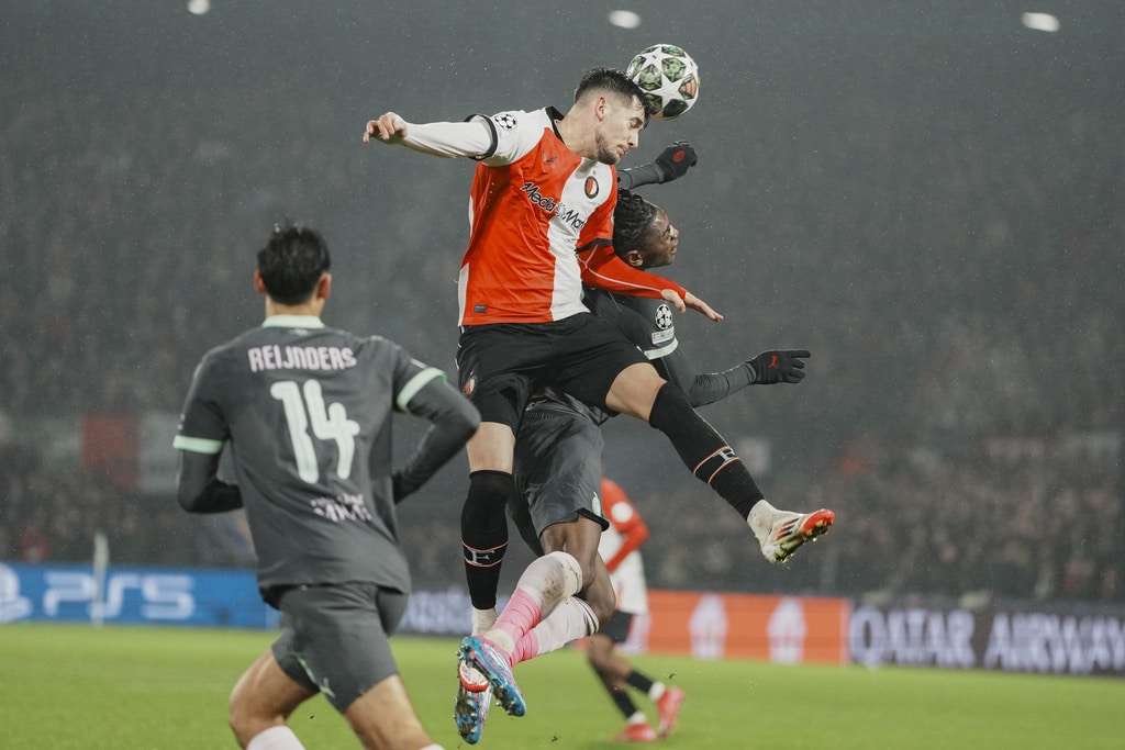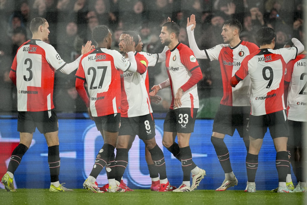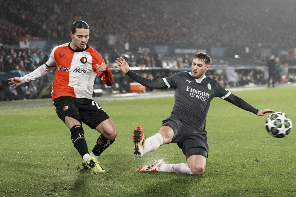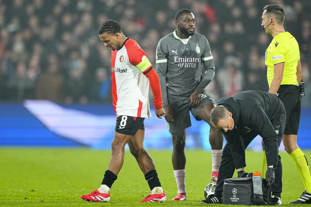 Feyenoord’s Quinten Timber leaves the pitch as he is substituted after an injury during the Champions League playoff first leg soccer match between Feyenoord and AC Milan, at the De Kuip stadium, in Rotterdam, Netherlands, Wednesday, Feb. 12, 2025. (AP Photo/Peter Dejong)AC Milan’s Joao Felix, right, challenges for the ball with Feyenoord’s Jakub Moder during the Champions League playoff first leg soccer match between Feyenoord and AC Milan, at the De Kuip stadium, in Rotterdam, Netherlands, Wednesday, Feb. 12, 2025. (AP Photo/Peter Dejong)Feyenoord’s Quinten Timber kicks the ball next to AC Milan’s Tijjani Reijnders during the Champions League playoff first leg soccer match between Feyenoord and AC Milan, at the De Kuip stadium, in Rotterdam, Netherlands, Wednesday, Feb. 12, 2025. (AP Photo/Peter Dejong)Feyenoord’s Jakub Moder, left, jumps for a header with AC Milan’s Rafael Leao during the Champions League playoff first leg soccer match between Feyenoord and AC Milan, at the De Kuip stadium, in Rotterdam, Netherlands, Wednesday, Feb. 12, 2025. (AP Photo/Peter Dejong)AC Milan’s Santiago Gimenez tries to stop a cross from Feyenoord’s Anis Hadj Moussa during the Champions League playoff first leg soccer match between Feyenoord and AC Milan, at the De Kuip stadium, in Rotterdam, Netherlands, Wednesday, Feb. 12, 2025. (AP Photo/Peter Dejong)Feyenoord’s players celebrate their opening goal, scored by Igor Paixao during the Champions League playoff first leg soccer match between Feyenoord and AC Milan, at the De Kuip stadium, in Rotterdam, Netherlands, Wednesday, Feb. 12, 2025. (AP Photo/Peter Dejong)