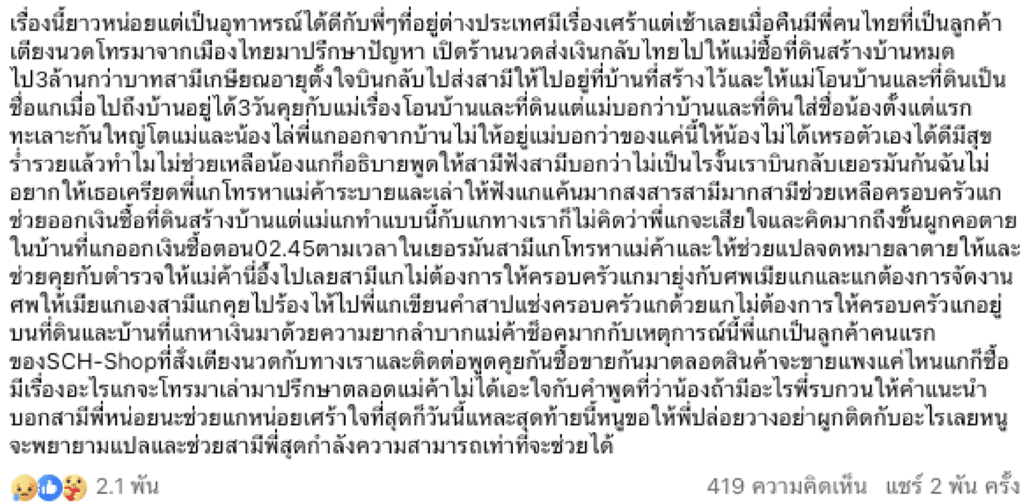 ผู้สื่อข่าวรายงาน โพสต์ไวรัลที่มีคนแชร์กว่า 2 พันครั้ง ผู้ใช้รายหนึ่ง ได้แชร์ประสบการณ์อุทาหรณ์ เรื่องราวอันน่าเศร้าของผู้หญิงไทยรายหนึ่ง ซึ่งเป็นลูกค้าเตียงนวดของเจ้าของโพสต์ ได้โทรศัพท์มาปรึกษาปัญหาจากประเทศไทย โดยเล่าว่าเธอและสามีชาวเยอรมันได้ทำงานเปิดร้านนวดเก็บเงินอย่างหนักในต่างแดน ส่งเงินกลับมาให้แม่ที่ประเทศไทยเพื่อซื้อที่ดินและสร้างบ้าน หมดเงินไปกว่า 3 ล้านบาท โดยมีจุดประสงค์เพื่อสร้างบ้านให้สามีที่เกษียณอายุได้กลับมาพักอาศัย และตั้งใจจะให้แม่โอนบ้านและที่ดินเป็นชื่อของเธอ