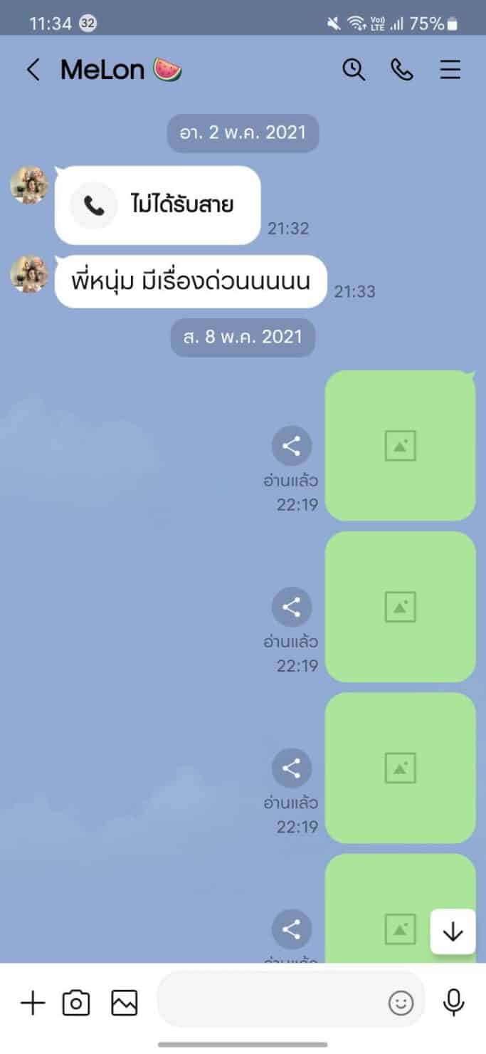 โดยแชตของวัน อยู่บำรุง ที่โพสต์เริ่มตั้งแต่วันที่ 2 พ.ค. 2021 เขียนว่า “พี่หนุ่ม (วัน อยู่บำรุง) มีเรื่องด่วน” ก่อนที่ในช่วงวันที่ 8 พ.ค. 2021 นาย วัน จะส่งรูปจำนวนมาก ซึ่งนายวันกล่าวว่าจำไม่ได้ว่าคุยเรื่องอะไร และภาพหมดอายุแล้ว ก่อนที่ทางแตงโมจะเขียนว่า “เดี๋ยวหนูโทรหานะคะ สักตี 1 นะพี่ เสร็จงาน พี่นอนยัง?”