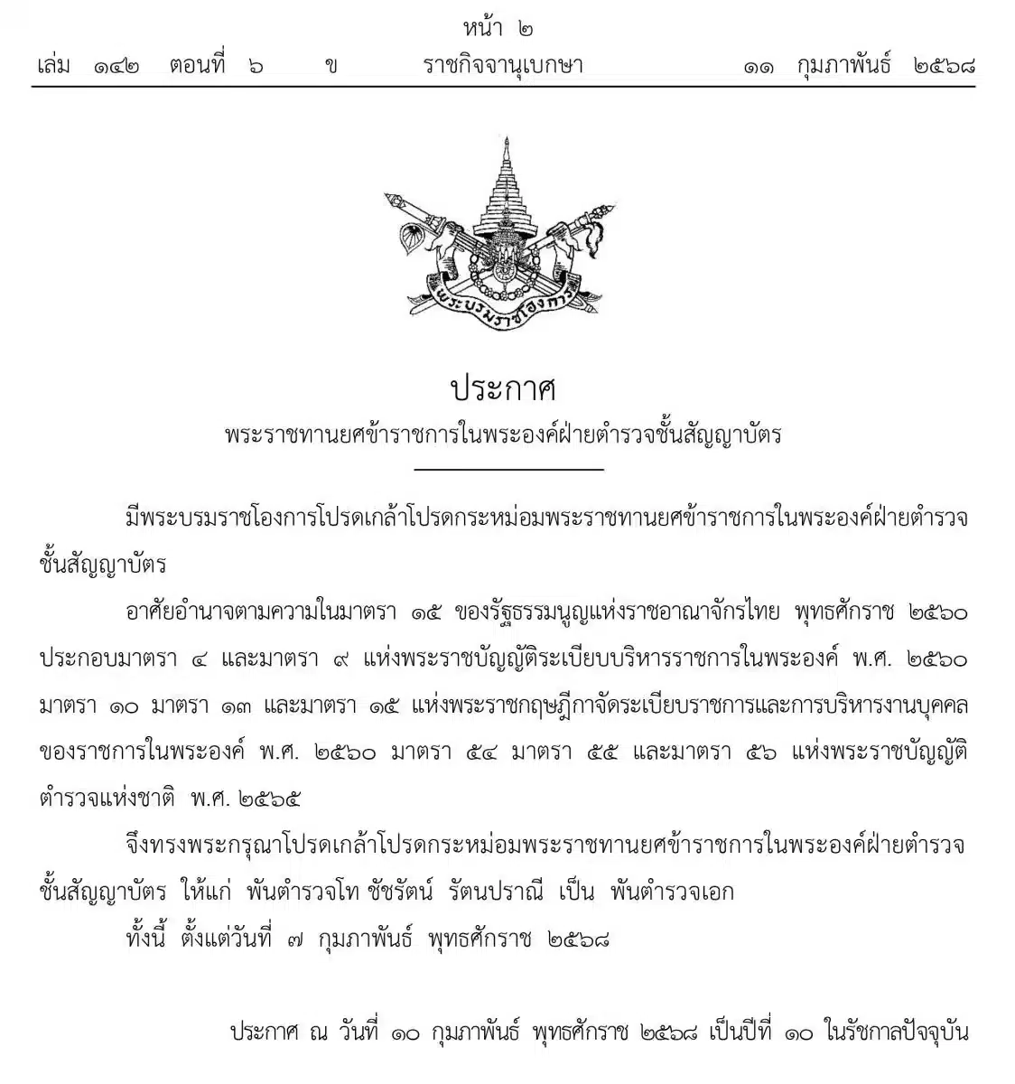 โปรดเกล้าฯ พระราชทานยศข้าราชการในพระองค์ ชัชรัตน์ เป็น พันตำรวจเอก