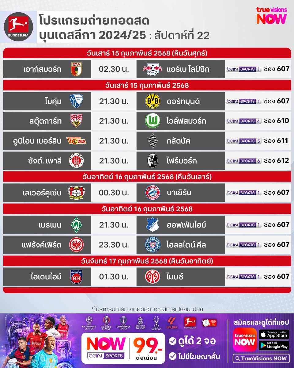 โปรแกรม บุนเดสลีกา เยอรมัน ประจำฤดูกาล 2024/25 สัปดาห์ที่ 22 ทุกคู่ ทางช่อง beIN Sports